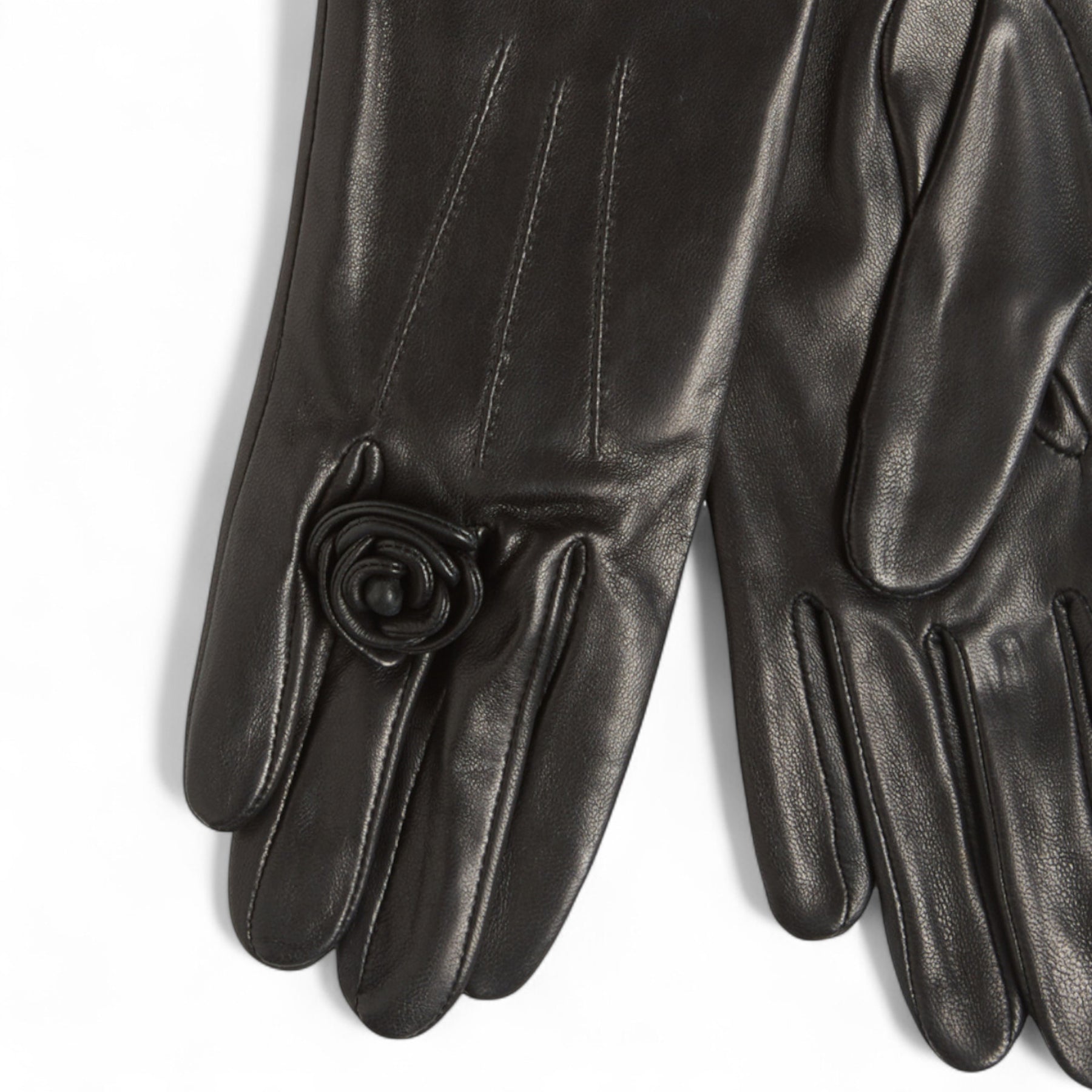 Delicate, poetic, and beautifully made, the Agnelle Cameabague Gloves blend timeless craftsmanship with a touch of romance. Cut from supple 100% lambskin leather, this feminine design features a sculpted flower detail placed artfully on the ring finger — a subtle adornment that feels like wearing a piece of jewelry. Fully lined in 100% silk, the gloves glide on effortlessly and offer a luxuriously soft feel against the skin. An exquisite accessory that elevates everyday dressing with understated charm.