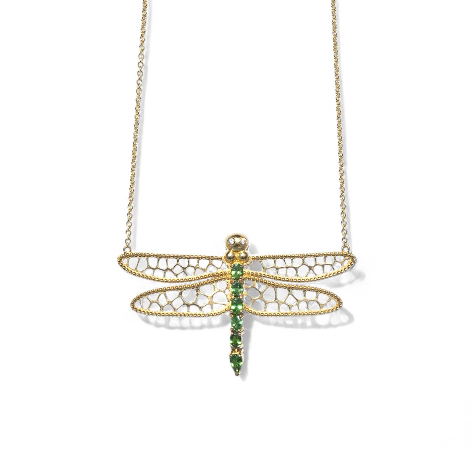 The Juliette Dragonfly Necklace captures the ethereal grace of one of nature’s oldest symbols of transformation. Dragonflies, born of water and reborn into air, embody adaptability and the quiet power of change. Handcrafted in 18k yellow gold, the pendant features a tsavorite body — a stone of vitality and renewal — and grey diamond eyes that shimmer with quiet intensity. A talisman of movement, light, and effortless evolution.