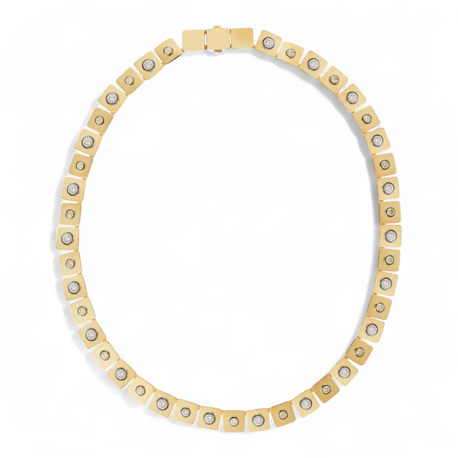 Crafted with precision, this 18k yellow gold necklace features large, shimmering tiles, each adorned with a single diamond. The diamonds are gently oxidized, enhancing their natural brilliance. Elevate any outfit with this elegant and timeless piece.