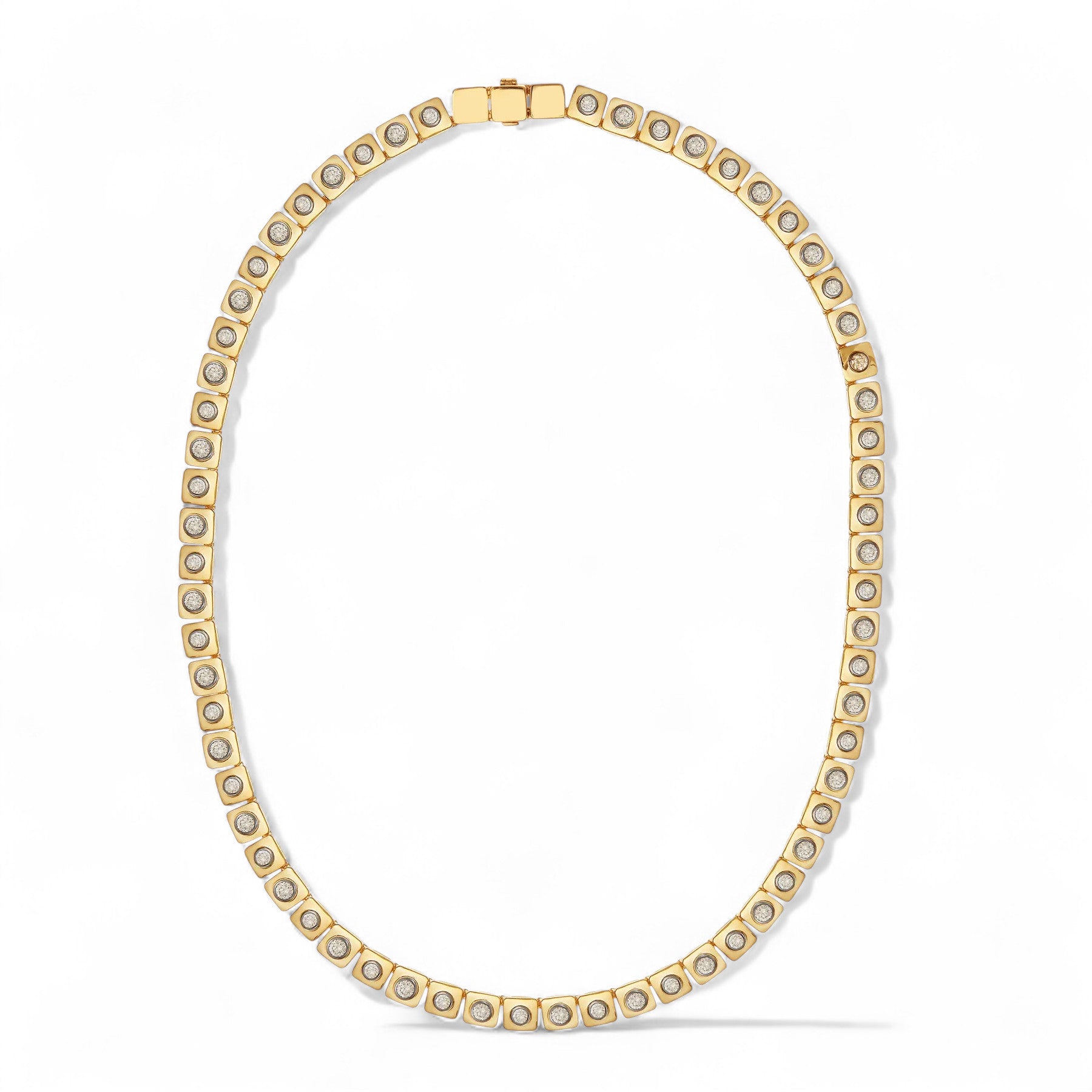 Expertly crafted from 18k yellow gold, the Medium Tile Diamond Necklace showcases 6mm shimmering tiles each adorned with a diamond center. The diamonds are lightly oxidized, enhancing their natural beauty. Perfectly hinged by hand, This necklace includes a magnetic clasp and safety closure for secure fastening and comfortable wear.