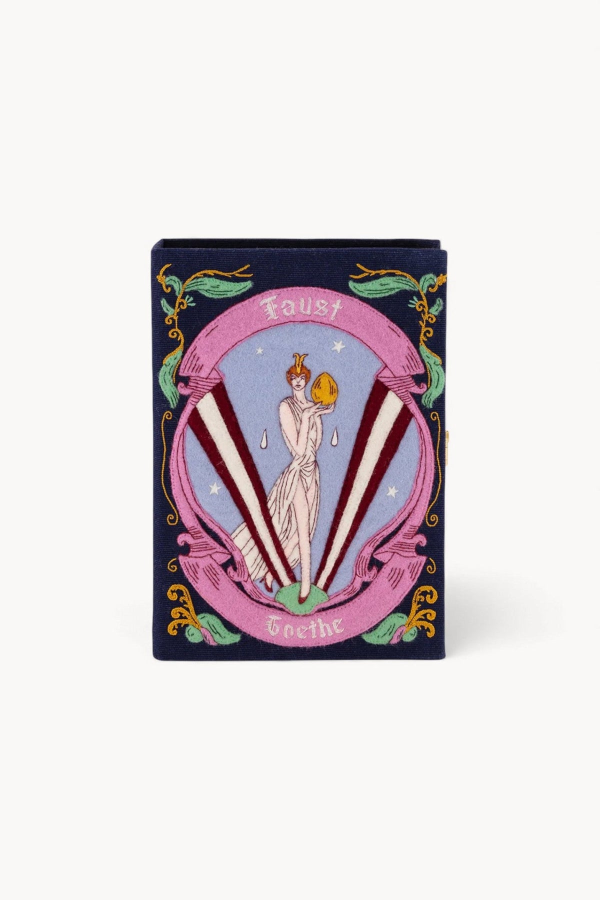 Indulge in the opulence of a handcrafted masterpiece - the Faust Goethe Clutch by Olympia Le-tan. Skillfully constructed with a stainless steel frame, hand-embroidered silk thread, and felt appliques, and featuring a distinctive Liberty® fabric lining, this clutch exudes elegance and sophistication. Elevate your style with a timeless, artisanal creation.