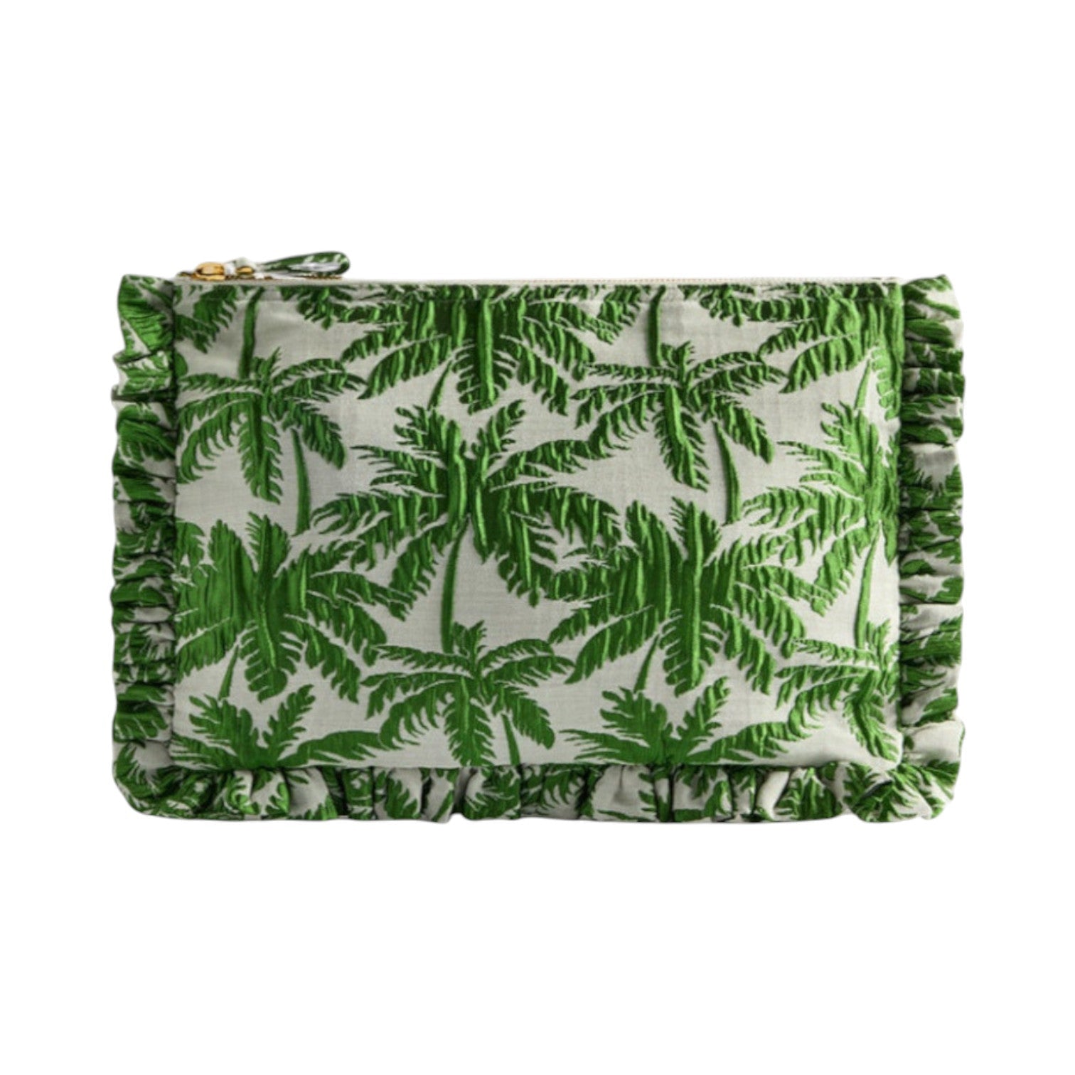 A piece to treasure, this soft oversized zip pouch in luxurious matelassé jacquard is as functional as it is beautiful. Designed to elevate your look from dinner to dancing, it comfortably fits your phone, mini tablet, and cardholder. The side handle offers effortless portability—leaving your hands free to hold a bellini at your next cocktail soirée.