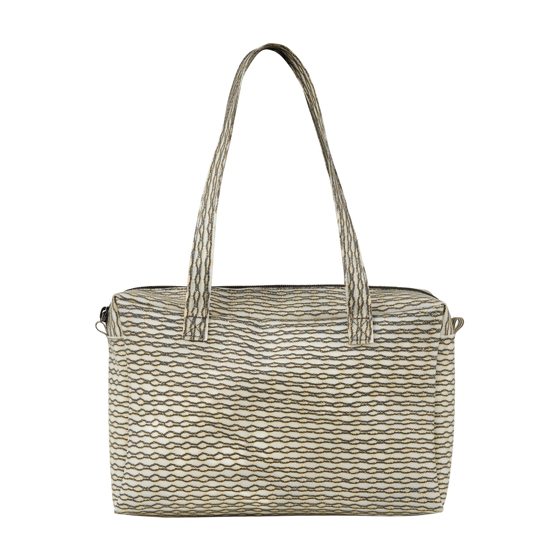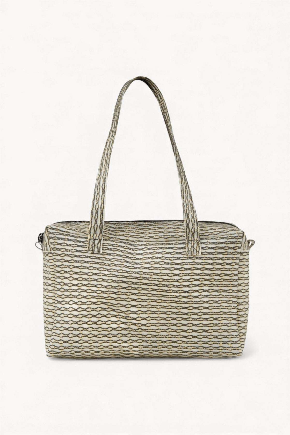 This versatile, detail-rich handbag from Luisa Cevese Riedizioni features a secure top zipper, crafted entirely from recycled textile scraps. Each piece is uniquely one-of-a-kind, making it truly special. Founded in 1996, Luisa Cevese Riedizioni brings innovation to sustainable design with its signature material, *II (eleven)*— a blend of upcycled textile fragments and polyurethane.