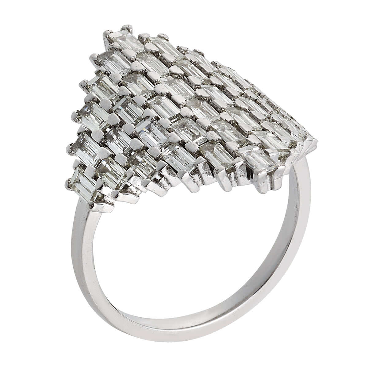 This Baguette Shield Ring W-D is handcrafted from polished 18k white gold, giving it a shimmering luster. The kite-shaped face resembles a shield and is adorned with white diamonds in shared prong settings, for maximum sparkle.
