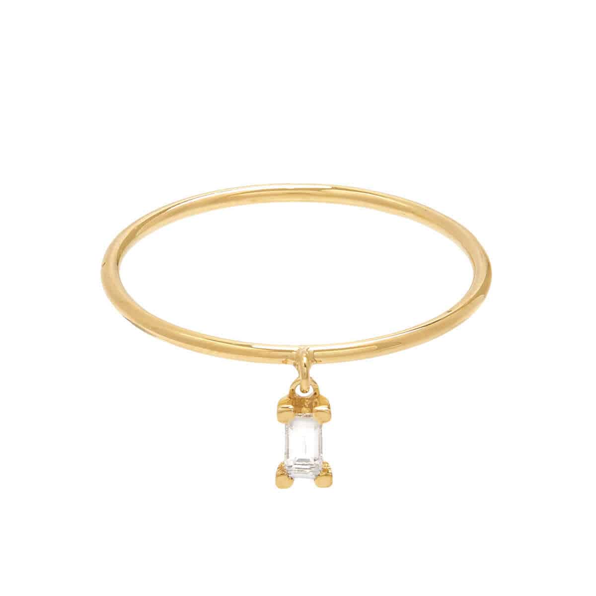 Luxuriate in timeless beauty with Ileana Makri's Single Baguette Dangling Ring. Handcrafted of polished 18k yellow gold, its delicate band is decorated with an animated Baguette white diamond that captivates with its graceful sparkle. An exquisite addition to any jewelry box, this ring is the epitome of understated luxury.