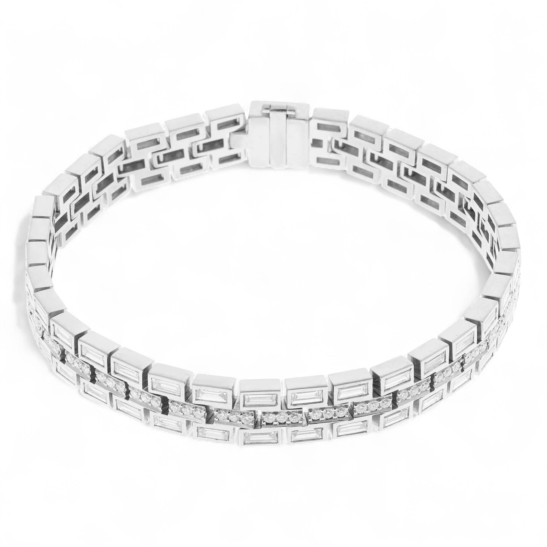 This exquisite Baguette Dream Bracelet is expertly handcrafted from polished 18k white gold and studded with two rows of sparkling white diamond baguettes and a row of pave round white diamonds. The luxurious design exudes elegance and sophistication and is the perfect statement piece.