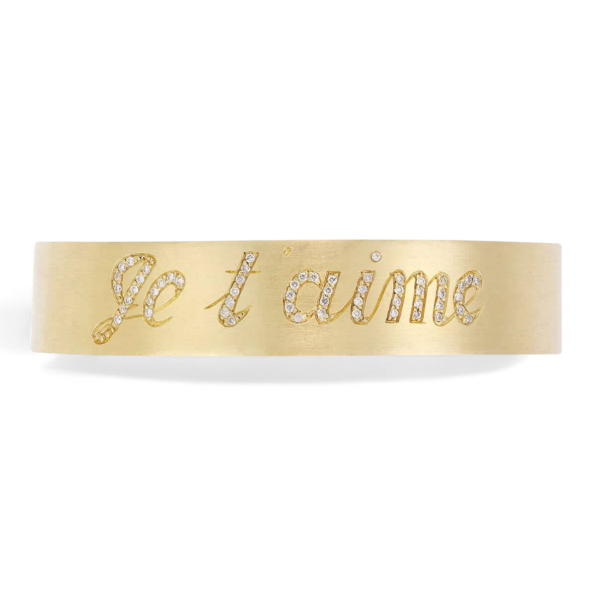 Elevate your expression of love with a shimmering reminder of your affection. Crafted in 18k yellow gold, this Je t'aime Cuff is encrusted with 0.22 cts of twinkling diamonds that speak the universal language of love. C'est magnifique!