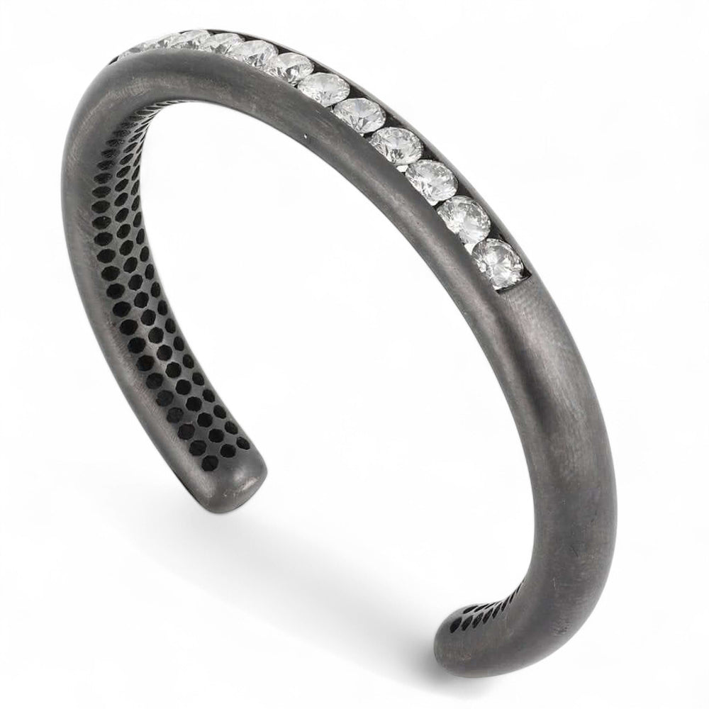 Designed with exquisite detail, the Queens Cuff is a stunning piece of jewelry crafted from 18k oxidized white gold and set with a stunning central row of sparkling round white diamonds. Intricately crafted, this cuff radiates sophistication and elegance, making it the perfect addition to any luxury wardrobe.