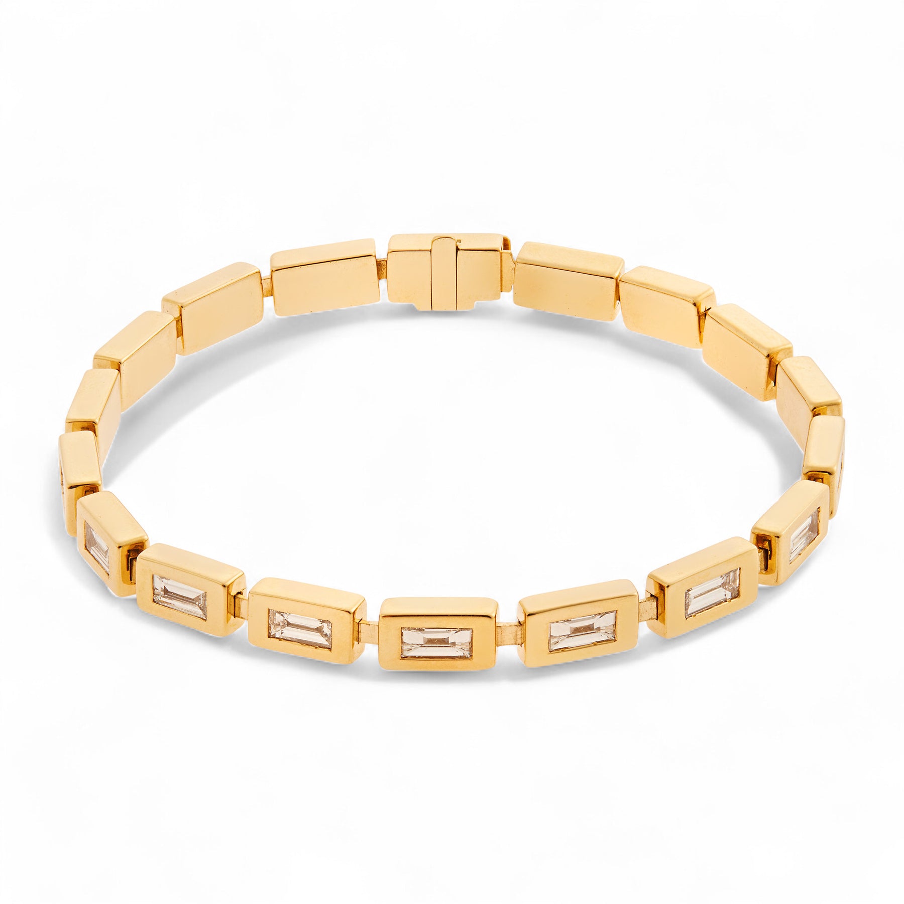 Adorned in the finest white diamond baguettes, this Waterfall Full Baguette Bracelet is crafted from 18k yellow gold exudes a timeless elegance. Meticulously handcrafted and luxuriously beautiful, this timeless piece is sure to make an unforgettable statement.