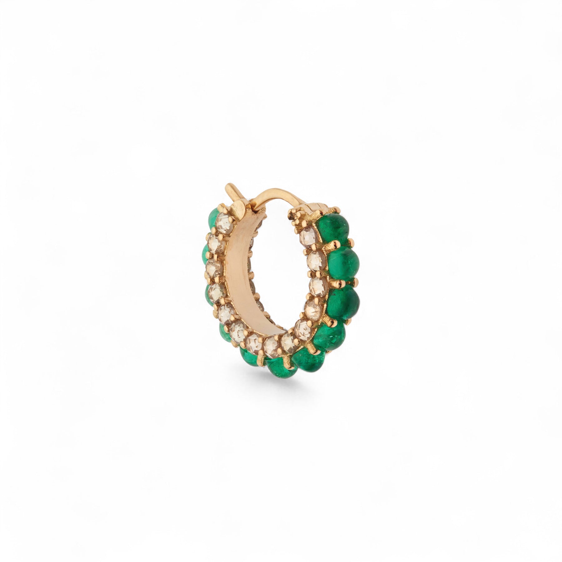 Made from 18k yellow gold, these Streamflow Hoops feature beautiful emerald cabochons encircled with rose-cut light champagne diamonds. Handcrafted with precision, these elegant earrings are a perfect addition to any collection.