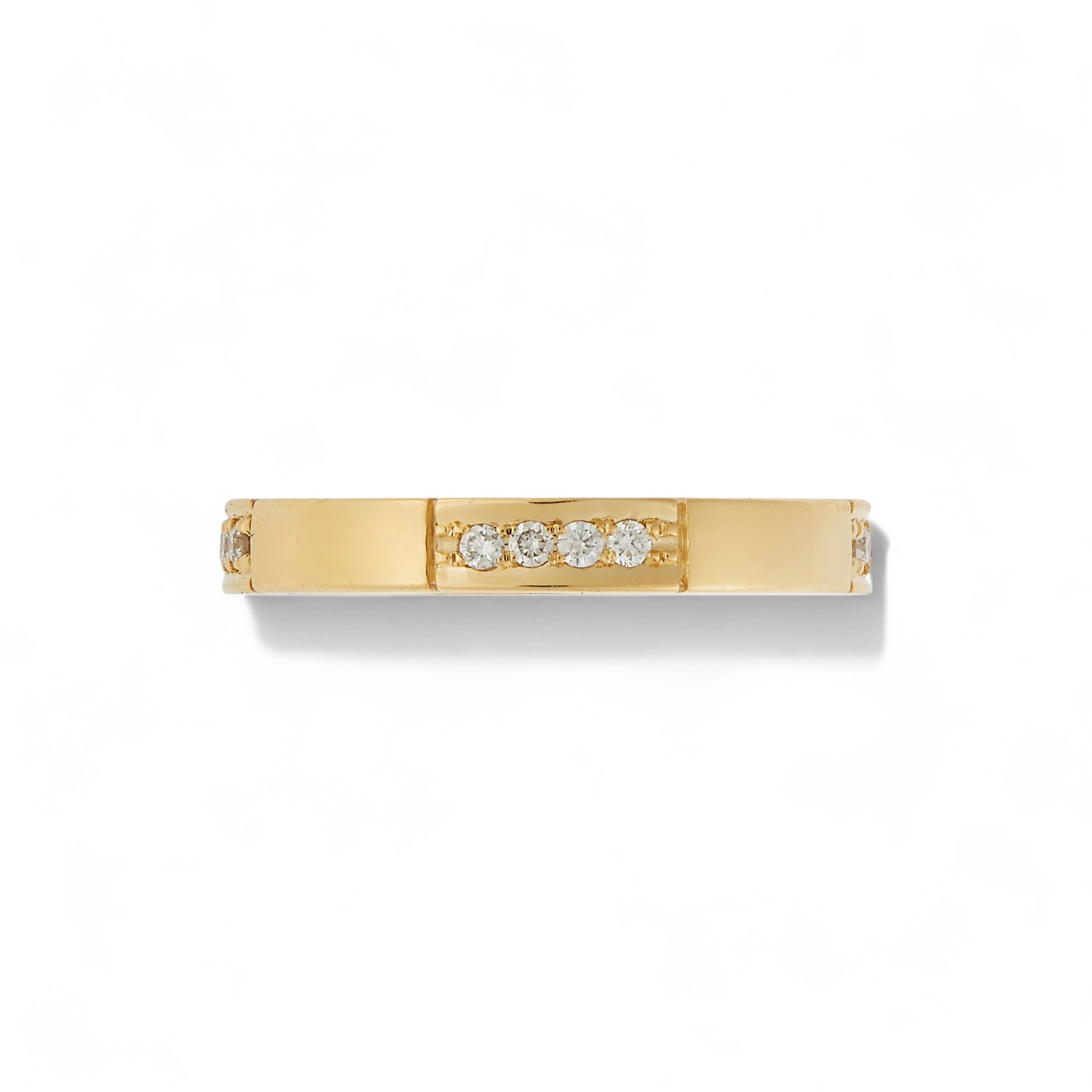 The Stream Ring is a classic piece, meticulously handcrafted with 18K yellow gold and set with white diamonds. Its minimalist design makes it ideal for stacking with other rings, allowing for endless personalization.