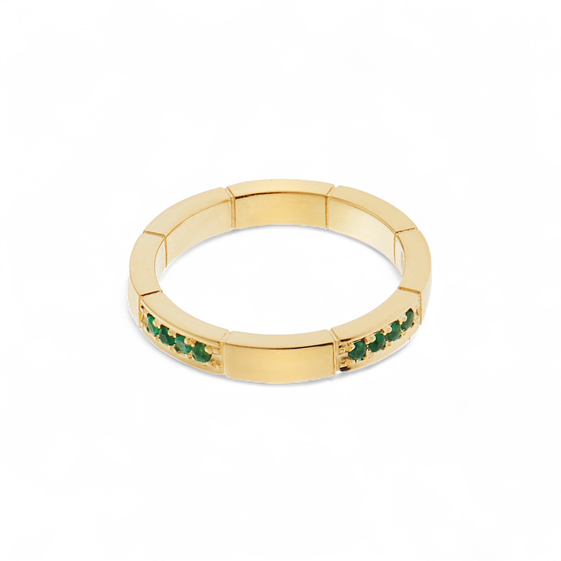The Stream Ring is a handcrafted luxury accessory made of 18k yellow gold and set with sparkling green emeralds. Its timeless design and versatile silhouette allow for endless styling possibilities, perfect for stacking with other favorite looks.