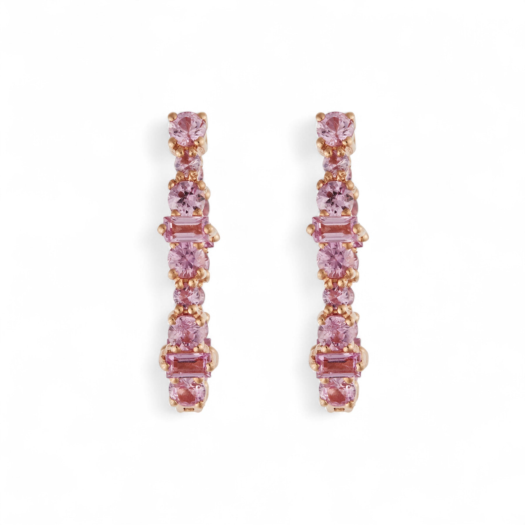 Radiant and feminine, the Large Oval Rivulet Pink Sapphire Hoops by Ileana Makri capture the delicate beauty of flowing light and color. Handcrafted from 18k rose gold, these elegant hoops feature alternating baguette and round-cut pink sapphires that shimmer with soft brilliance. Their sculptural oval form and refined craftsmanship make them a graceful statement piece, perfect for elevating both everyday looks and evening elegance.