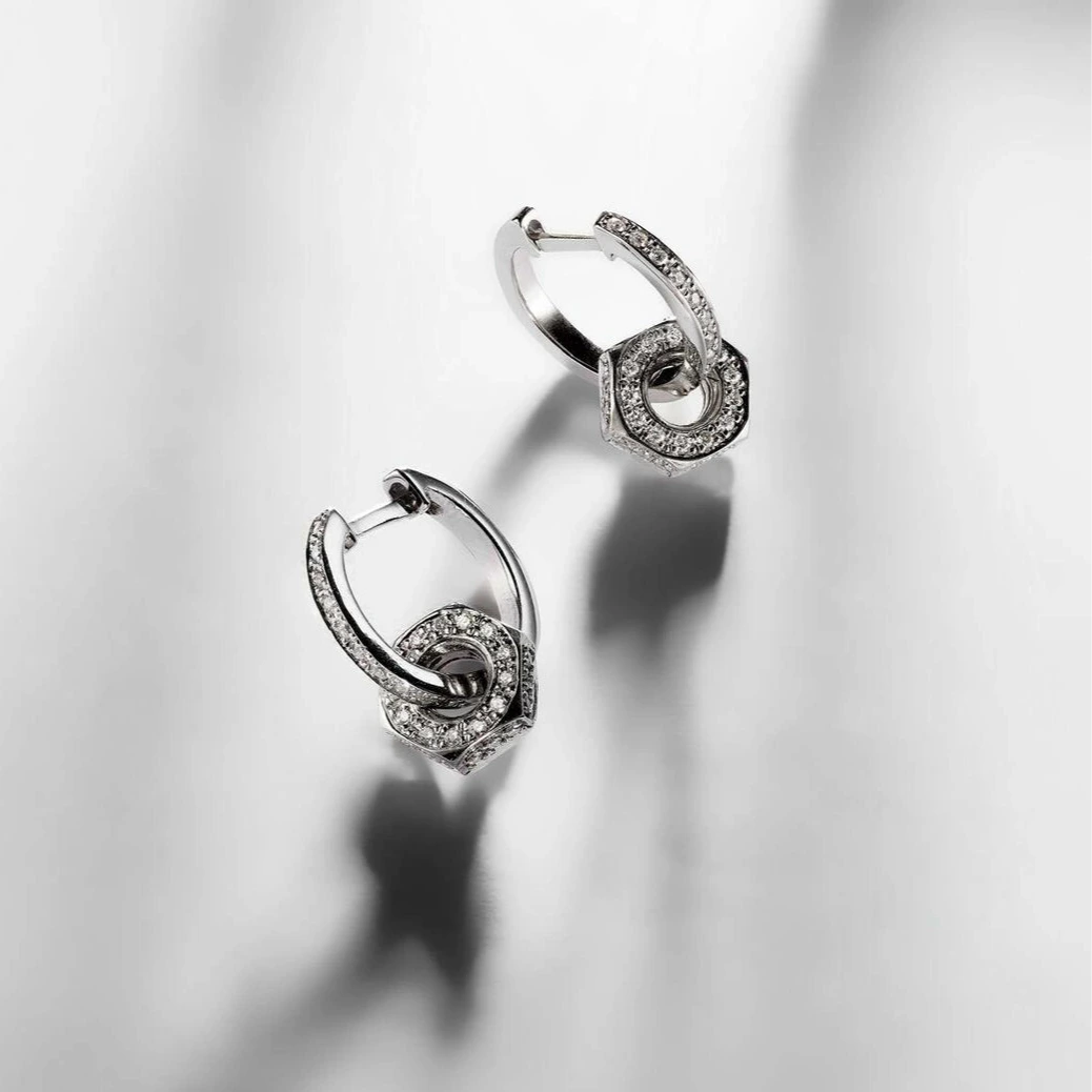 A striking fusion of edge and elegance, the Diamond Nut Earrings from Divine Mechanics reimagine the beauty of everyday hardware through the lens of fine jewelry. Handcrafted in 18k white gold and adorned with pavé-set white diamonds, each earring transforms the humble nut into an emblem of strength, balance, and refined rebellion. Designed with a post back for pierced ears, they embody the collection’s ethos — celebrating the overlooked essentials that hold everything together, rendered here in luminous precision and poetic form.