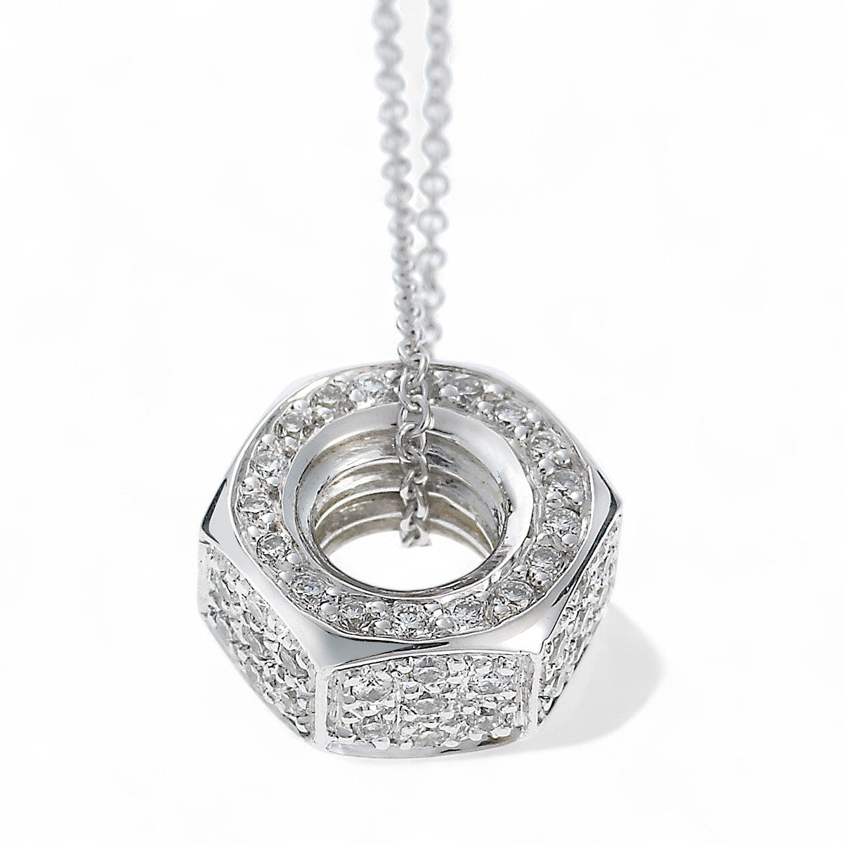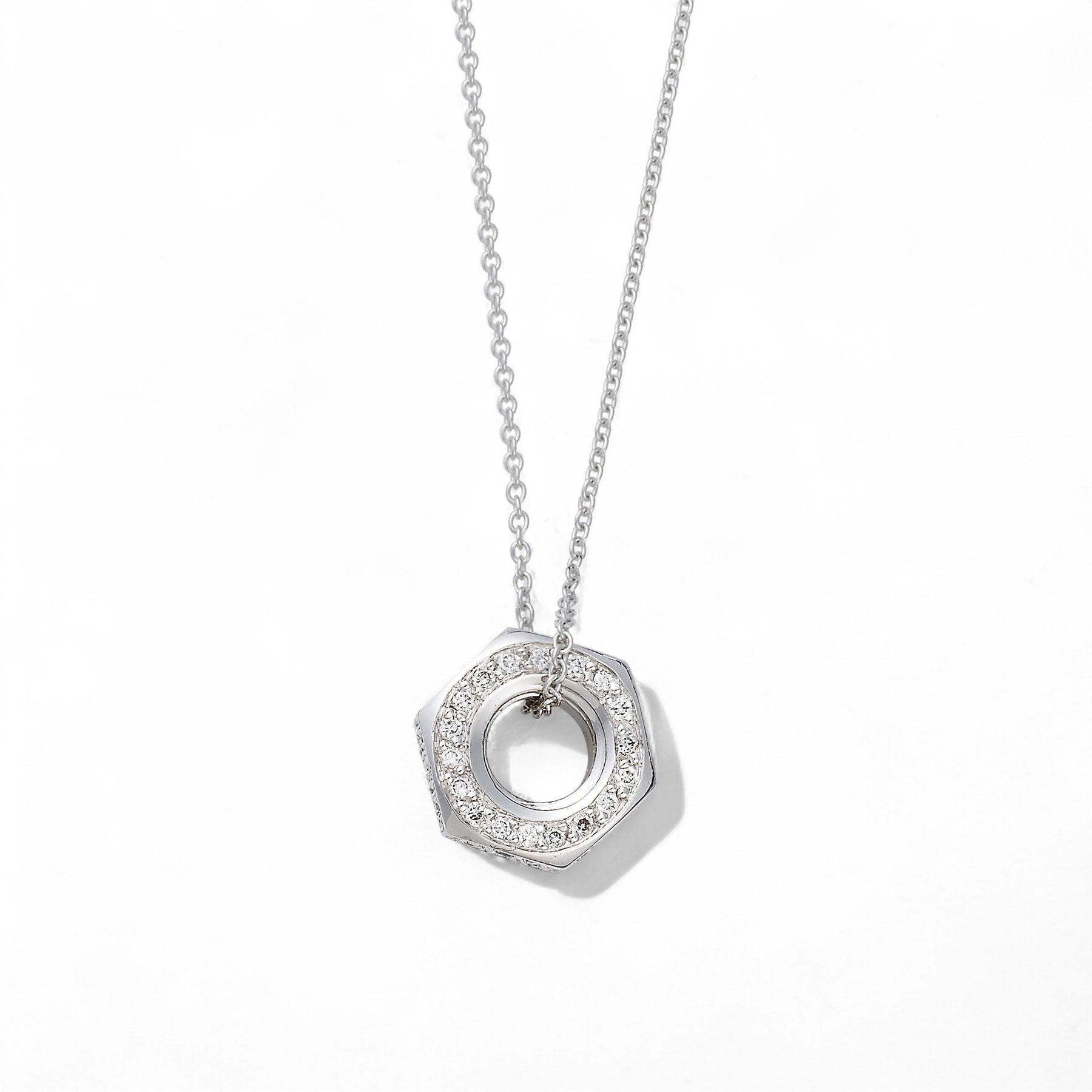 An emblem of refined rebellion, the Diamond Nut Pendant from Divine Mechanics elevates the utilitarian into the extraordinary. Handcrafted in 18k white gold and fully set with pavé white diamonds, this sculptural pendant captures the harmony between strength and elegance. Its clean geometry and luminous surface evoke the quiet beauty of the unnoticed — the essential tools that keep our world together, reimagined in precious form. Available with or without an 18k white gold cable chain in three lengths, secured with a lobster clasp.
