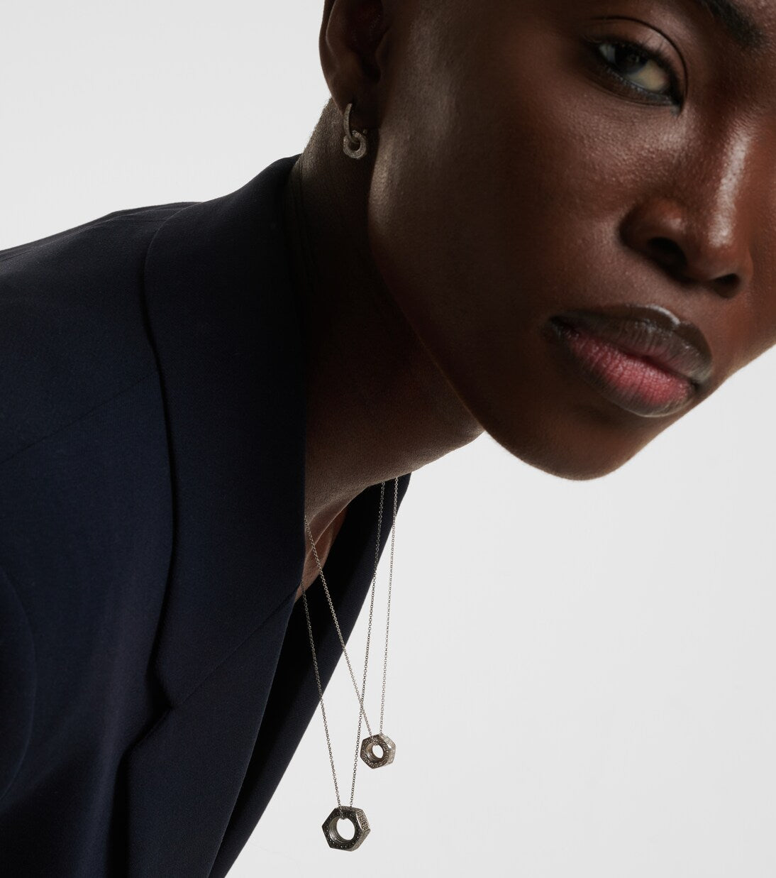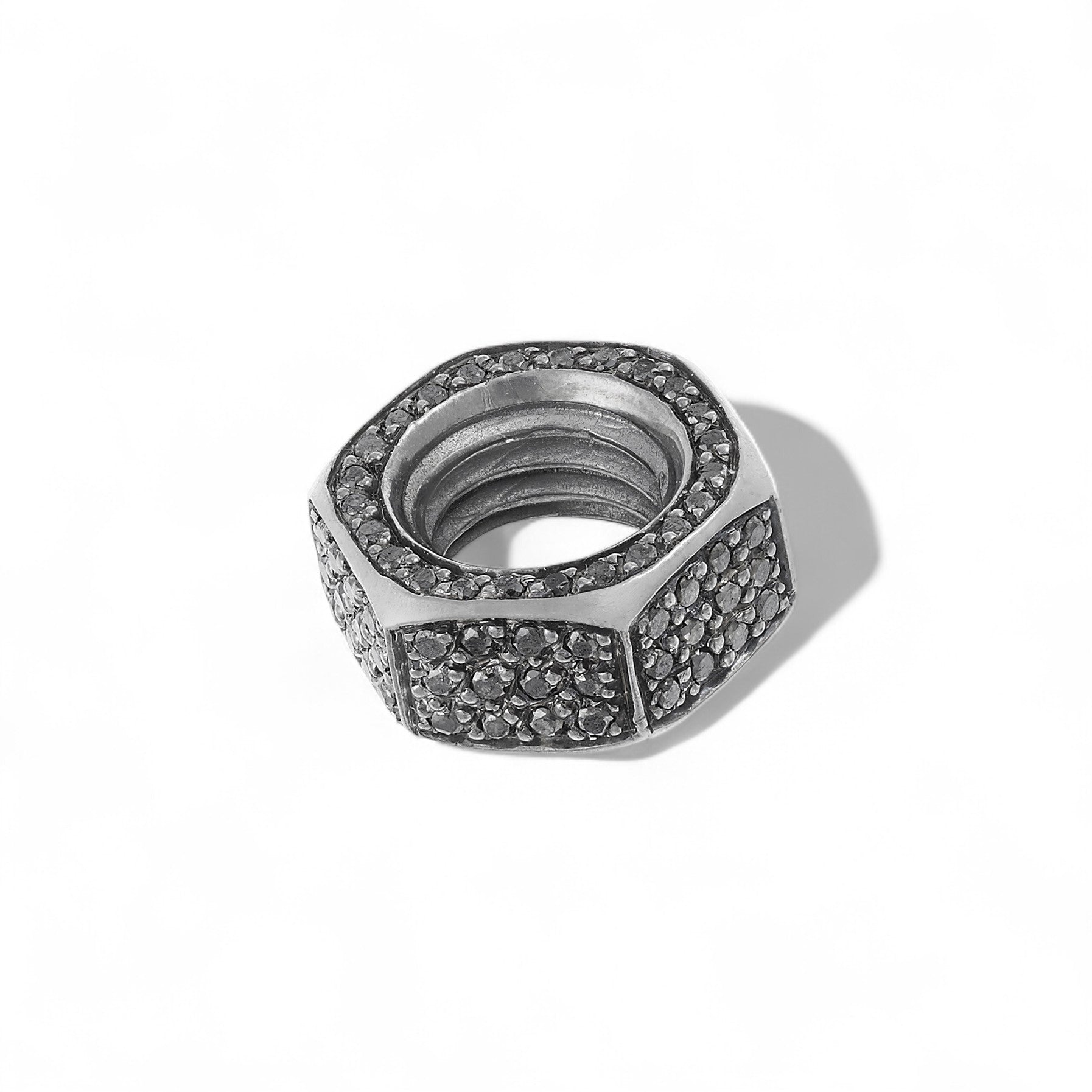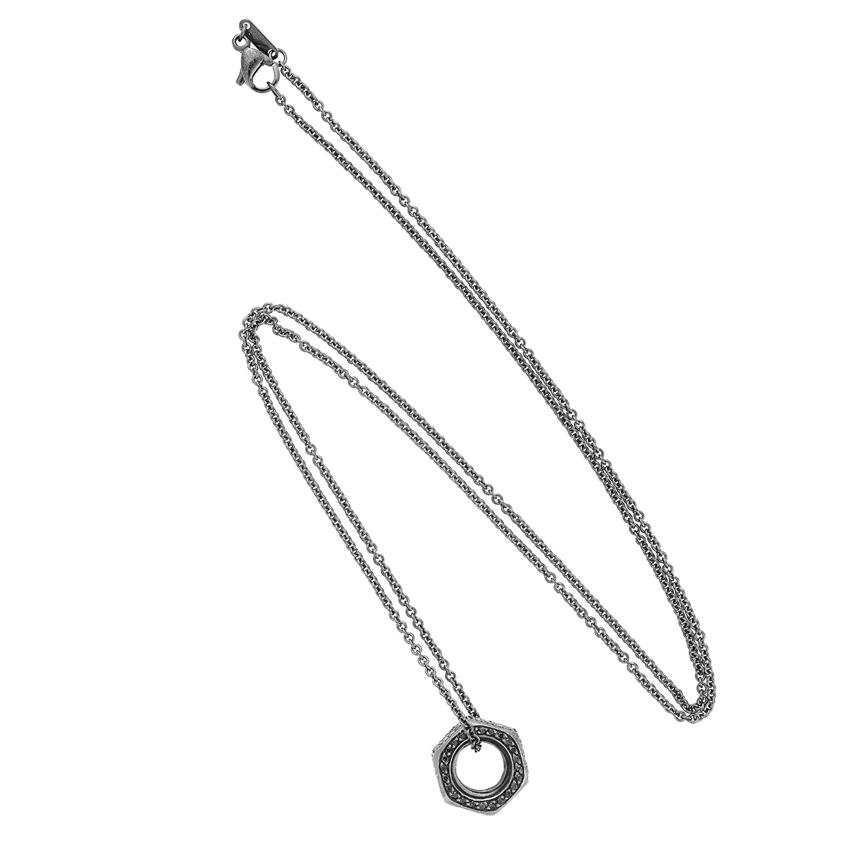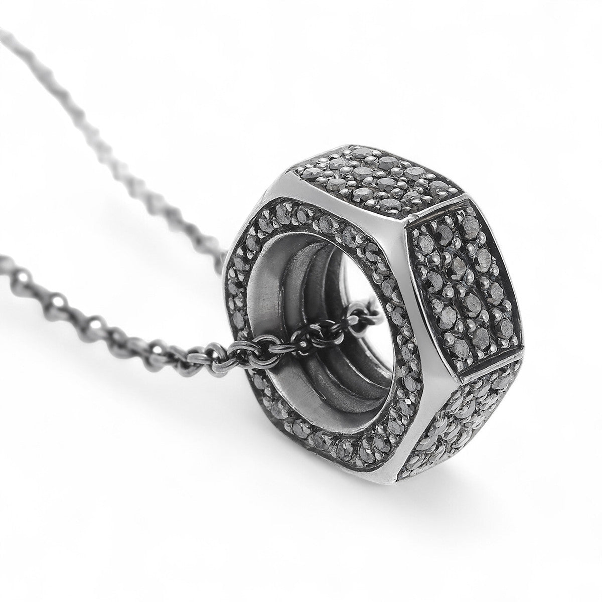 Where strength meets sensuality. The Black Diamond Nut Pendant from Divine Mechanics transforms a utilitarian form into a striking symbol of connection and resilience. Crafted in oxidized sterling silver and adorned with a pavé of black diamonds, this sculptural piece balances industrial edge with refined luxury. Suspended on an 18k white gold oxidized chain, it celebrates the beauty of objects that quietly hold the world together — bold, tactile, and unexpectedly poetic.