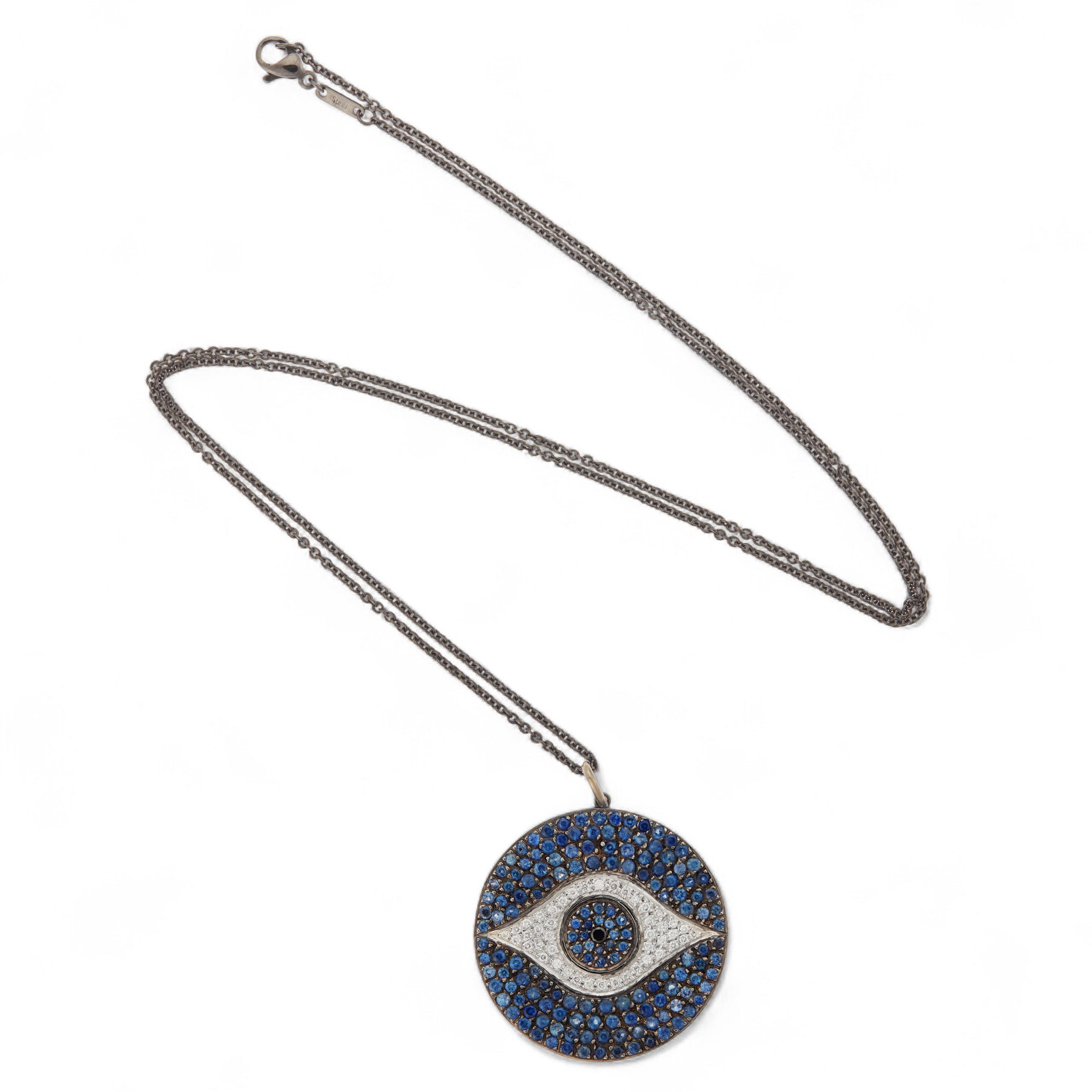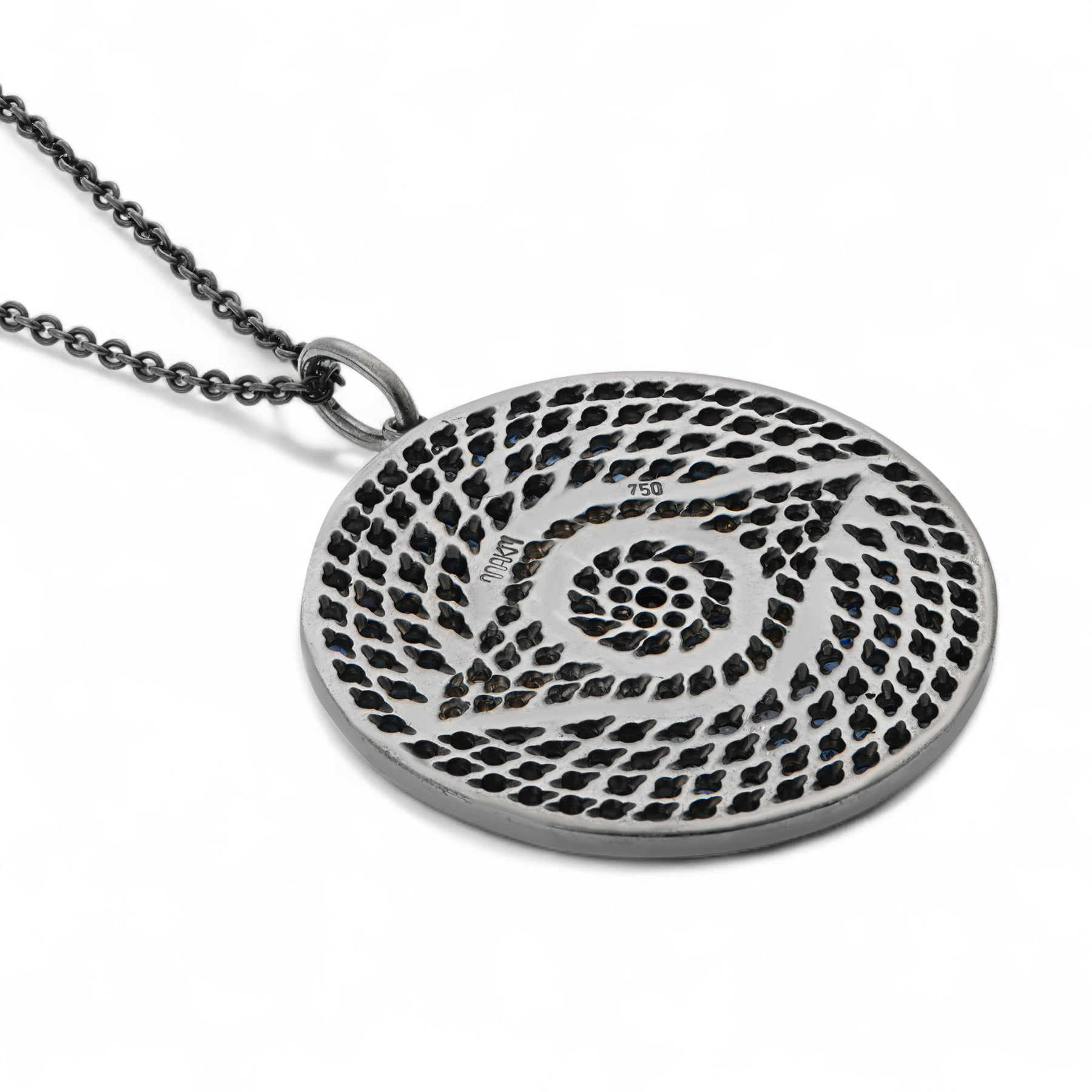 Capture timeless beauty with this Awakening Pendant crafted from 18K oxidized white gold. Featuring a classic blackened steel chain and an exquisitely sparkling center black diamond, this pendant is further accented by pavé of both white diamond and blue sapphire—which will bring a breathtakingly exquisite touch to any look.