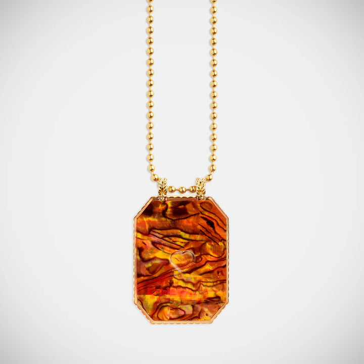 The Raiz’in Scapular Mother of Pearl Ochre (34mm) by Marie Lichtenberg is a radiant statement piece crafted in lustrous ochre-toned mother-of-pearl resin. At its heart lies an enameled Evil Eye, framed by a golden sunburst motif symbolizing protection and light. Suspended from a 46cm grain d’or chain with a PVD gold finish, this necklace brings warmth, depth, and bold modernity to any look.