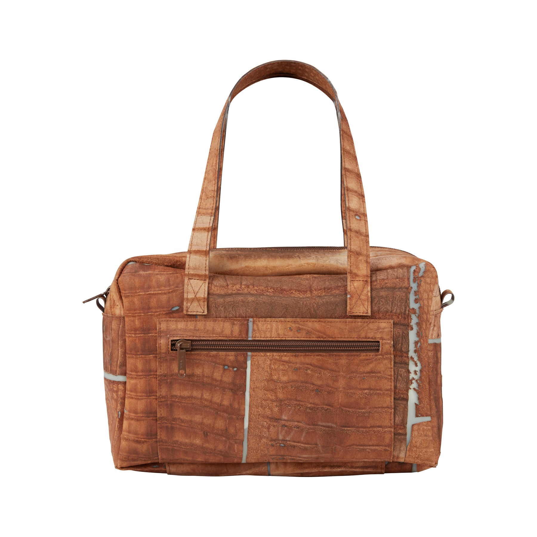 This versatile, detail-rich handbag from Luisa Cevese Riedizioni features a secure top zipper and a convenient front pocket, crafted entirely from recycled textile scraps. Each piece is uniquely one-of-a-kind, making it truly special. Founded in 1996, Luisa Cevese Riedizioni brings innovation to sustainable design with its signature material, *II (eleven)*—a blend of upcycled textile fragments and polyurethane.