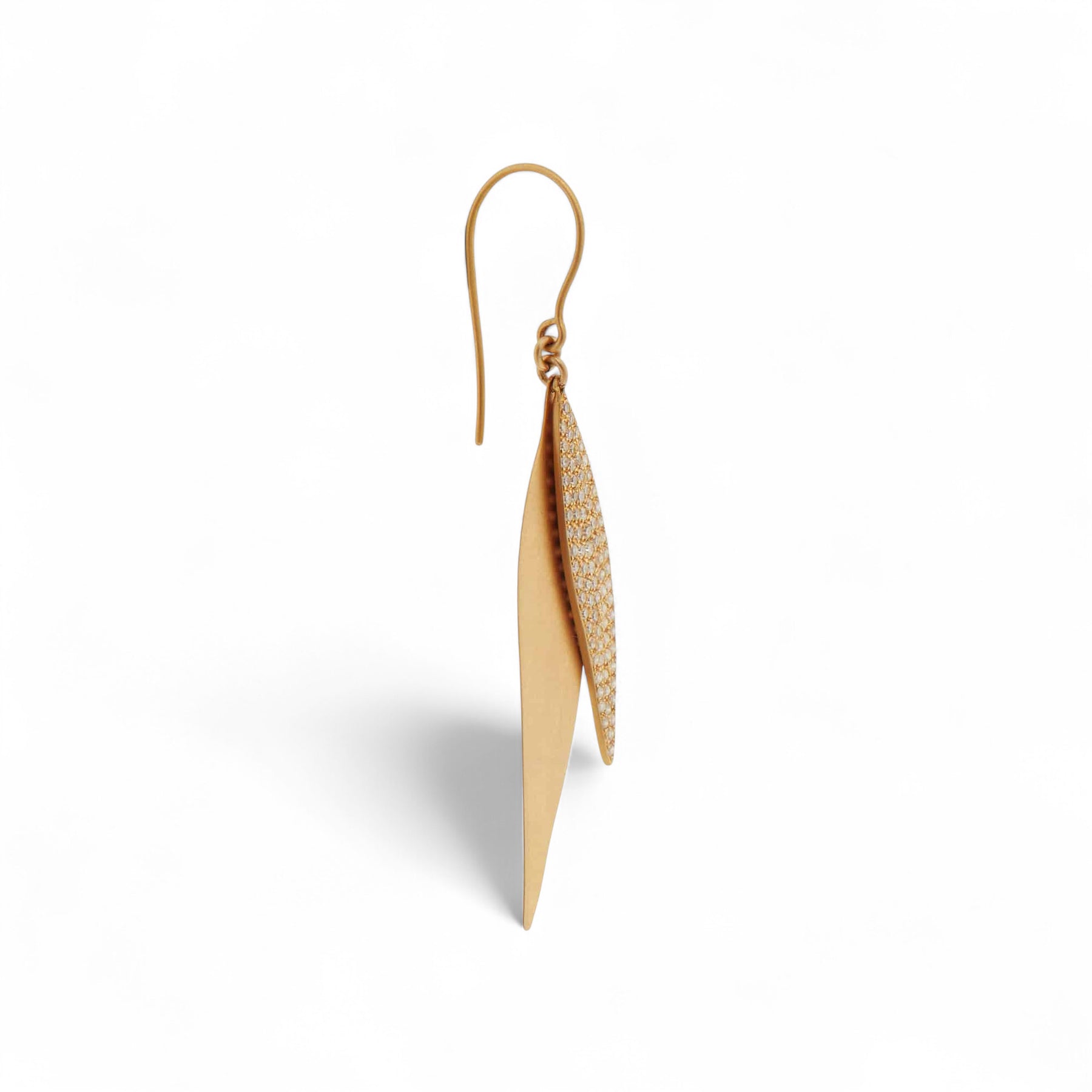 The Falling Leaves Duo Earrings are an ode to the beauty of nature. These light and airy earrings, crafted from 18k yellow gold and adorned with pave diamonds. With delicate movement, they evoke the sensation of falling leaves gently cascading in the breeze.
