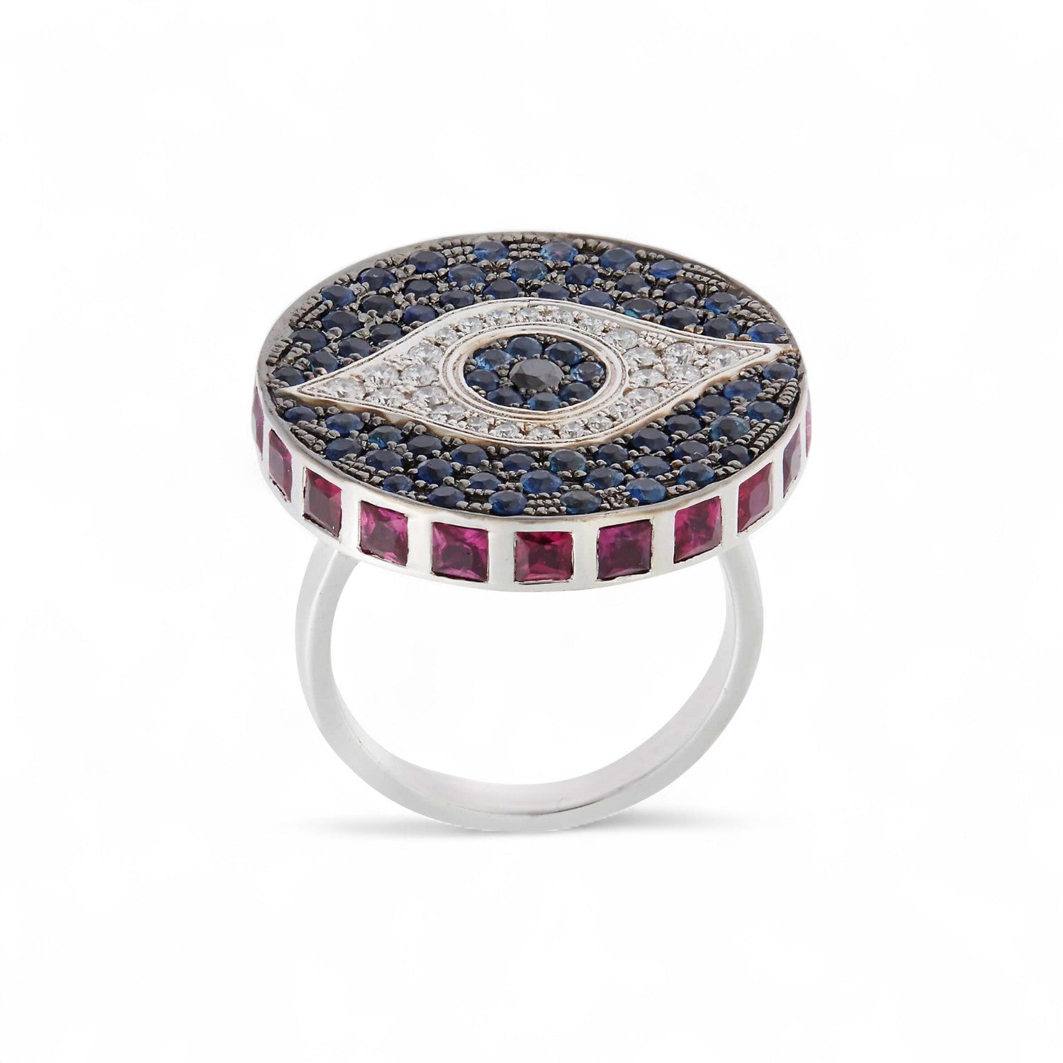 Handcrafted from polished 18k white gold, Ileana Makri’s Dawn Candy Ring is a striking composition of color, light, and symbolism. The face is pavé-set with deep blue sapphires, black and white diamonds arranged in a protective eye motif—an emblem of intuition and clarity—while a rim of square-cut rubies adds a bold, luminous contrast. Elegant and powerful, this handcrafted piece embodies the essence of modern mysticism and timeless craftsmanship.