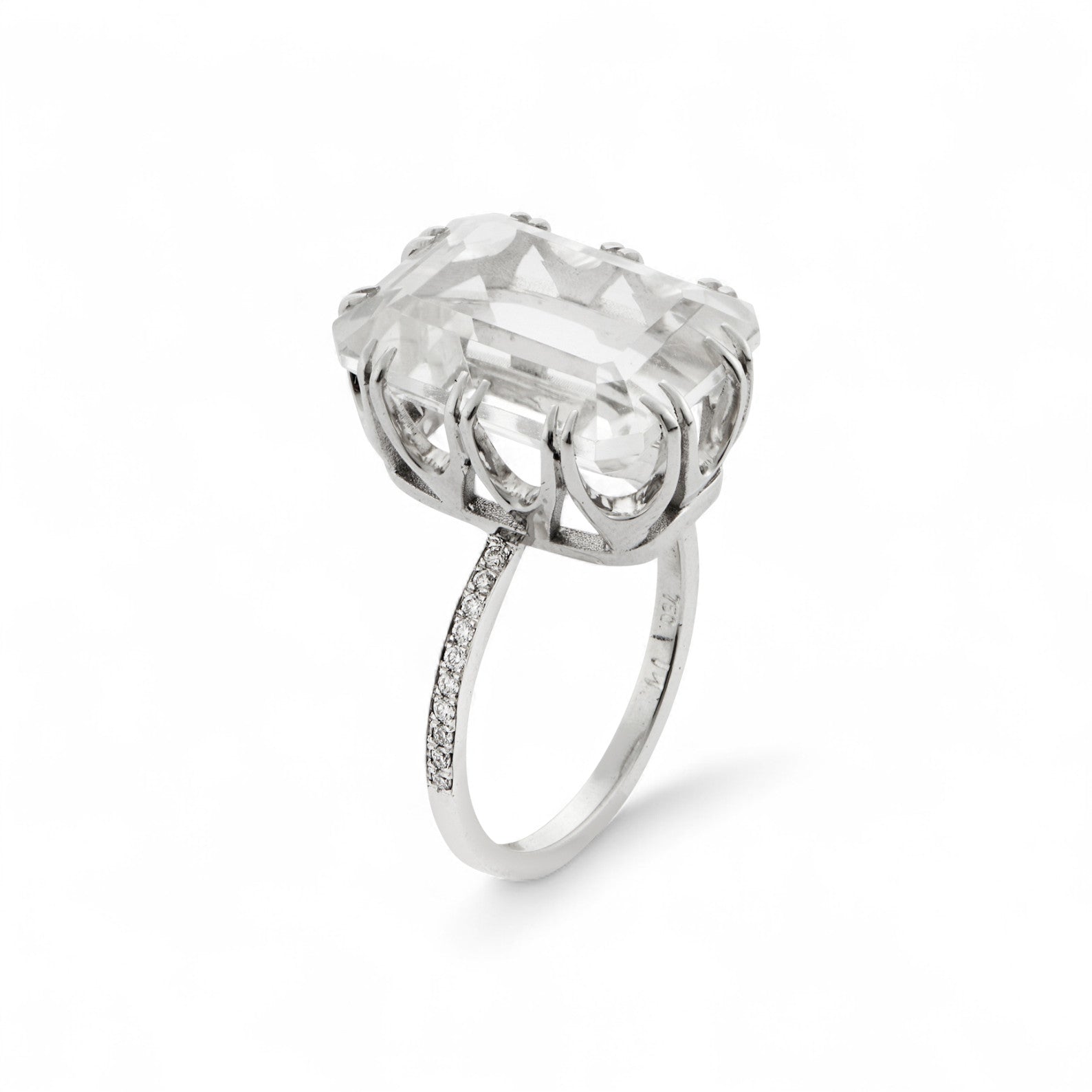 This elegant 18k white gold ring features a dazzling emerald-cut white topaz in a handcrafted crown setting. The band is adorned with sparkling white diamonds, adding a touch of luxury to this timeless piece. Perfect for those who appreciate classic beauty with a modern touch.