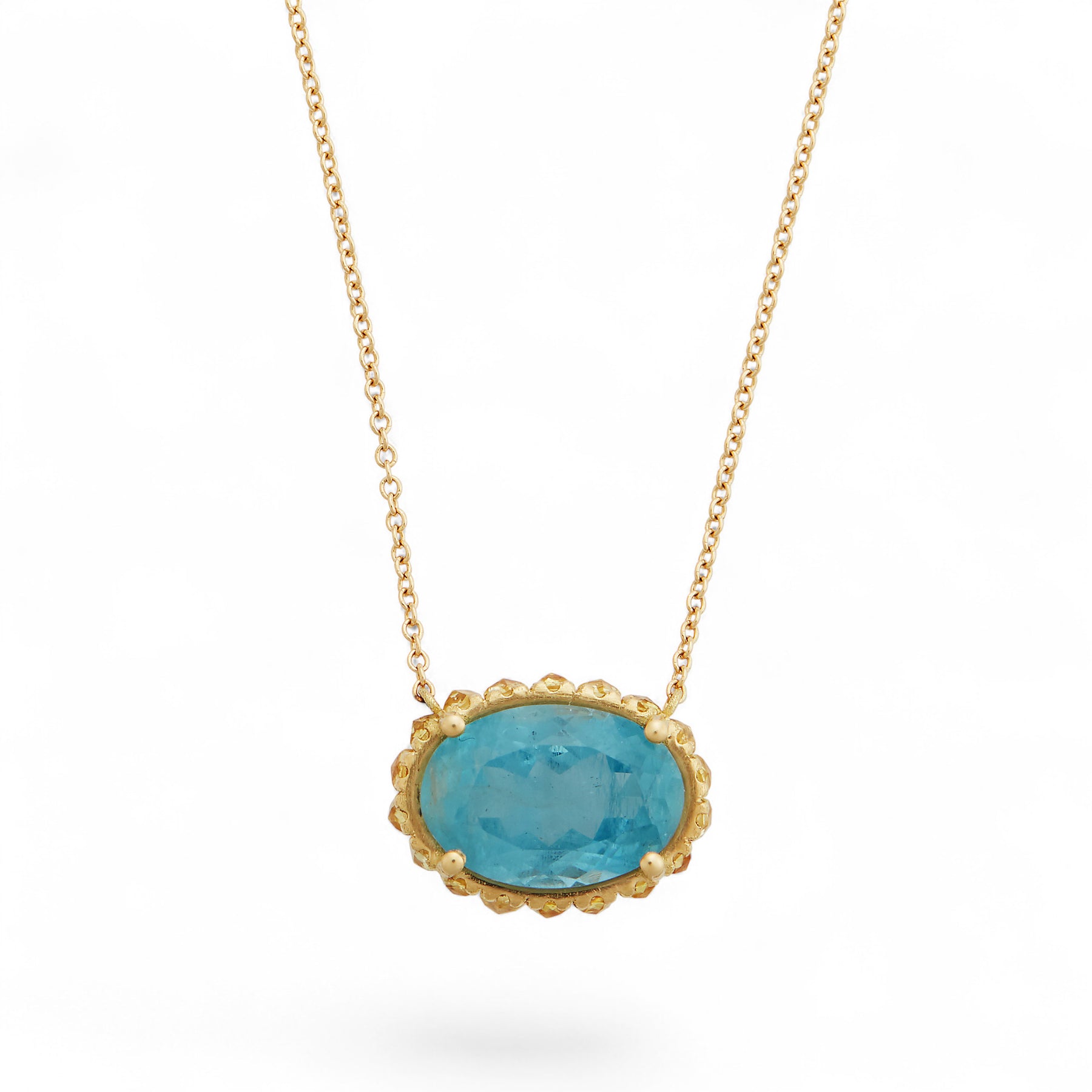 This unique necklace is crafted in 18k yellow gold, featuring a stunning Aquamarine at its centre, accented by yellow rose-cut sapphires. Its 45cm length is perfect for adding a touch of elegance to any look, making it a timeless and versatile piece.