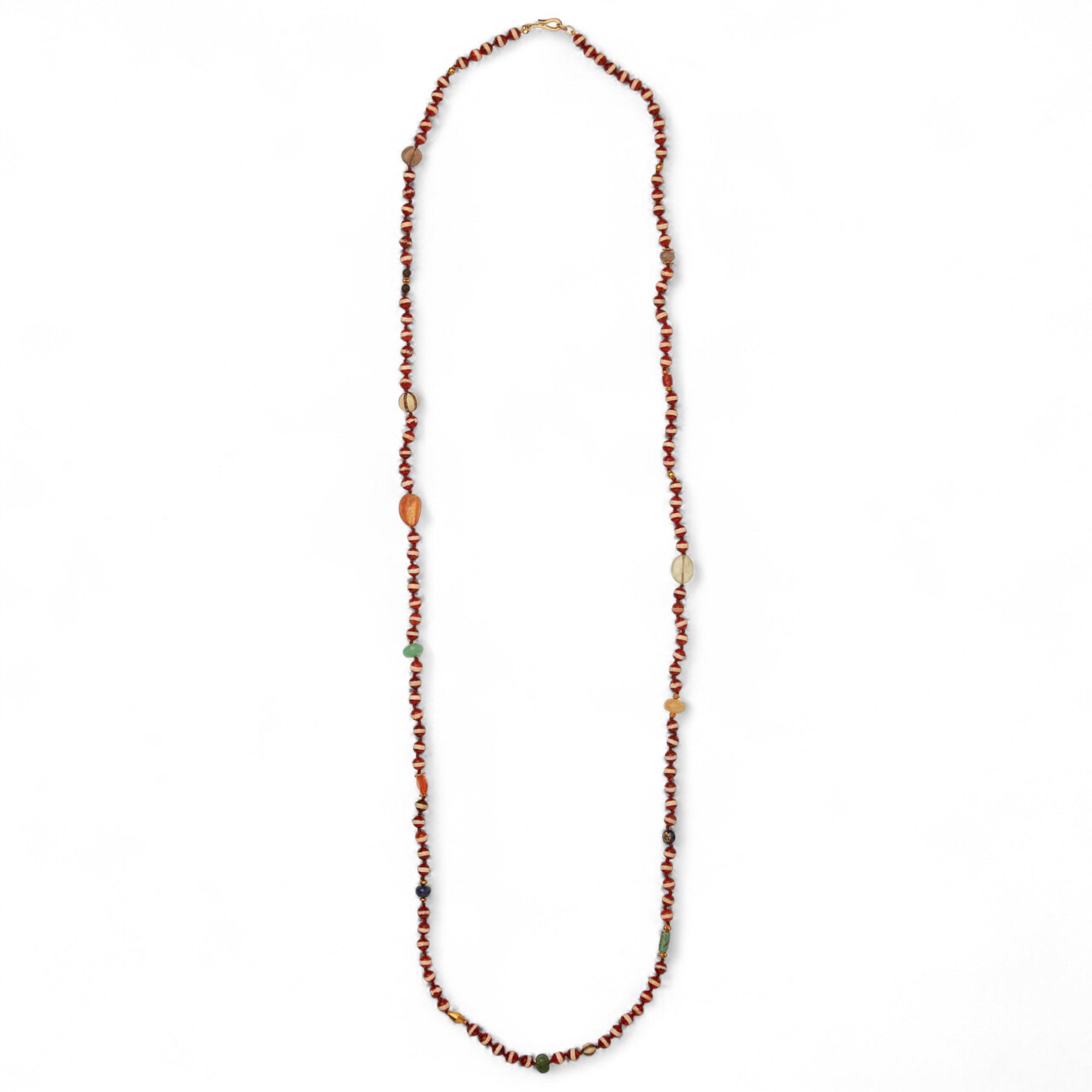 This Brown Agate Stripe Necklace 38 (1m) is a magnificent piece inspired by travels from around the world. Created with Tibetan Brown Agate Stripe beads, 18k gold beads, semi-precious gems, and a 9k yellow gold hook closure, it's a stunning addition to your jewelry collection.