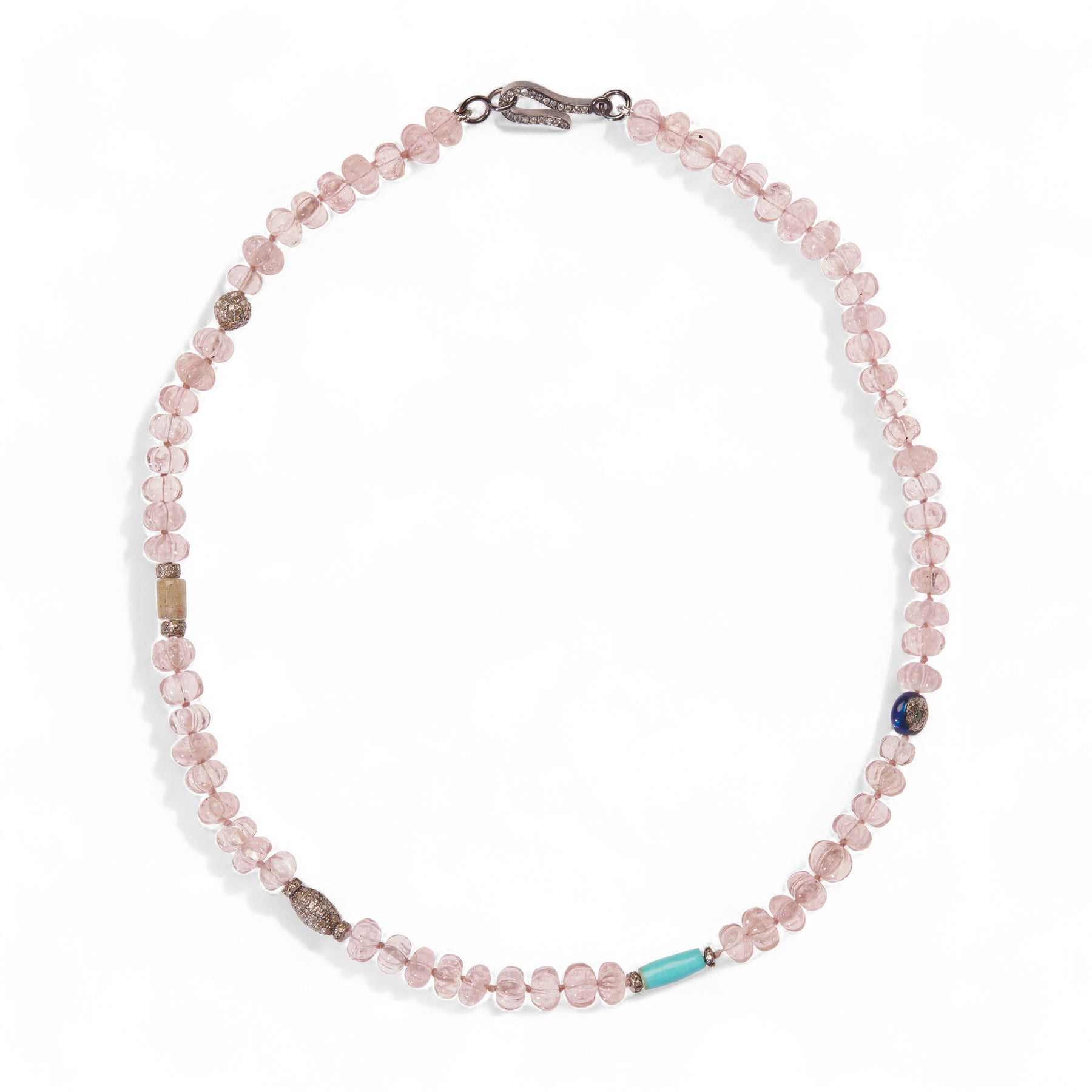 Soft and radiant, the Morganite Trail Necklace brings together pastel beauty and artisanal detailing in a compact, elegant 38cm silhouette. Featuring delicately carved morganite melon beads, this piece is accented with turquoise, labradorite, and sterling silver motifs set with grey diamonds. A sleek oxidized 18k white gold clasp completes the look. Perfect for layering or as a statement on its own, it evokes a sense of quiet luxury with a bohemian soul.