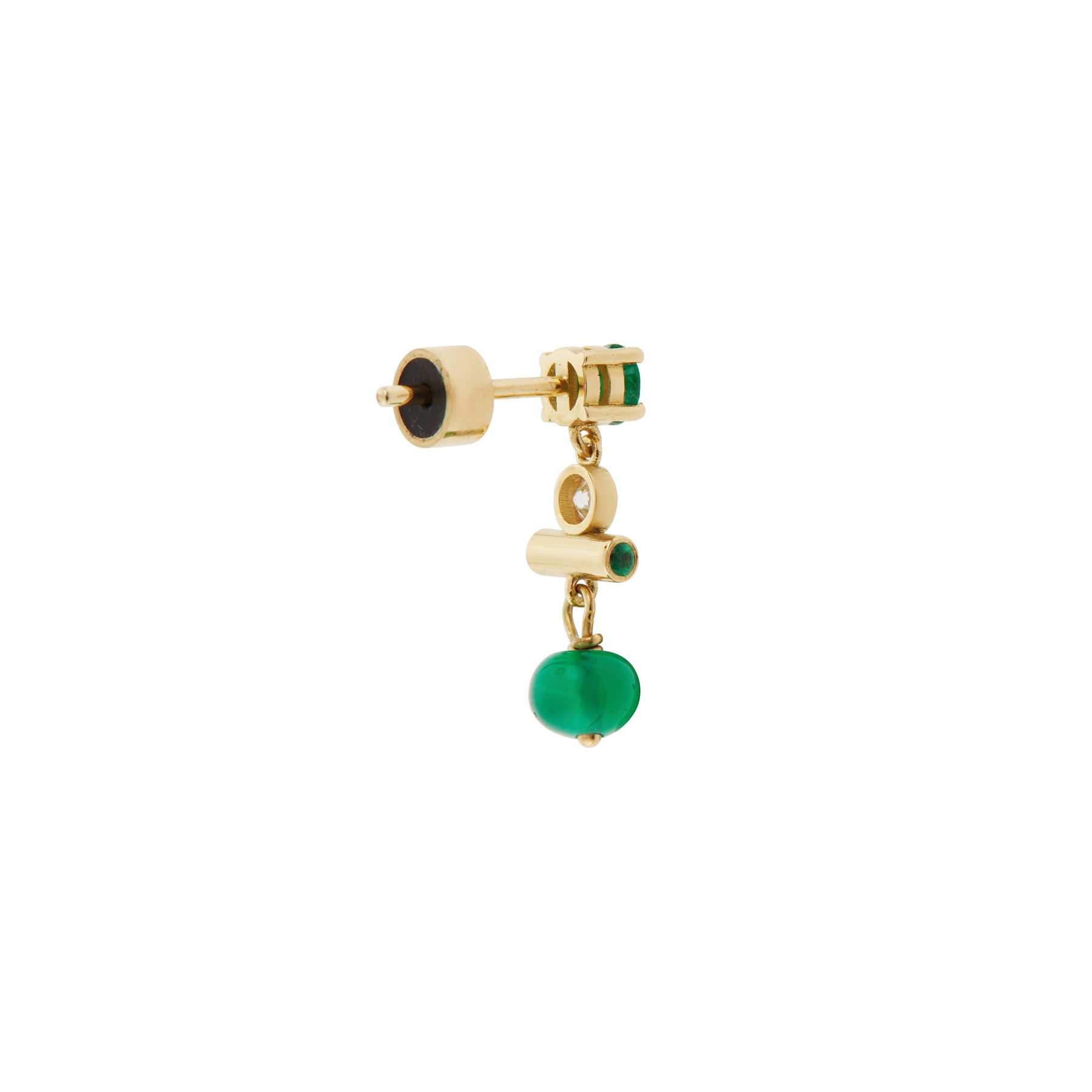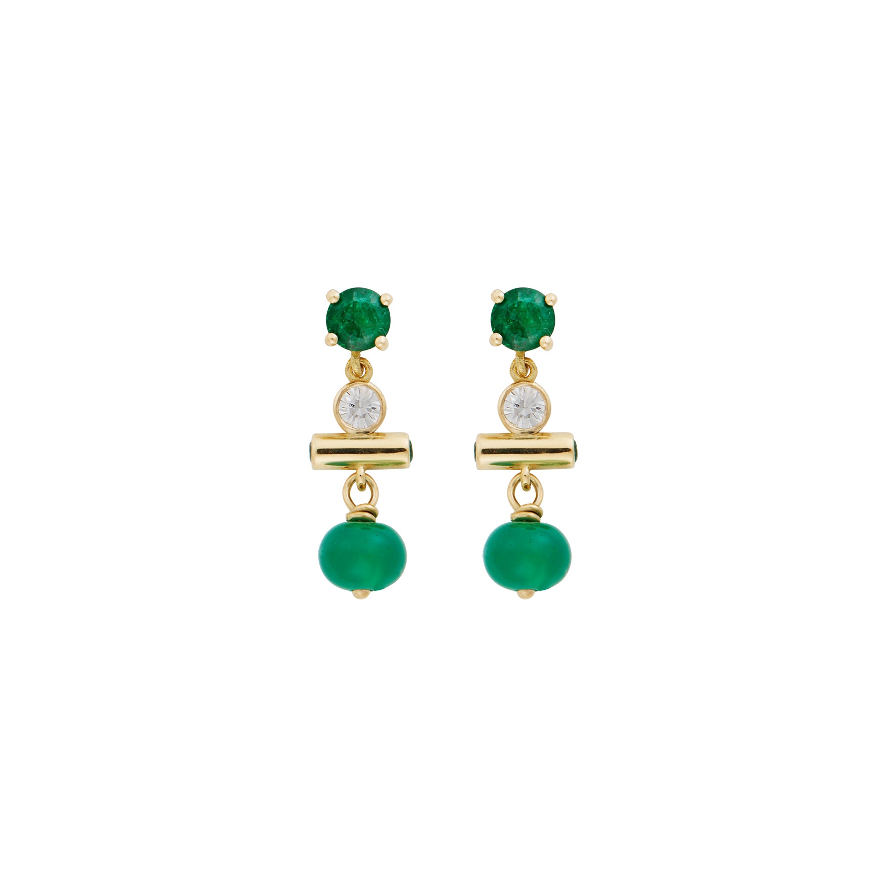 Discover refined elegance with the Mini Emerald Edge Earrings, where round-cut emeralds and white diamonds unite with vibrant emerald beads in a harmonious design. Meticulously crafted in 18k yellow gold, these compact earrings balance classical architectural inspiration with contemporary sophistication. Their kinetic movement catches light beautifully, making them an ideal choice for everyday wear that transcends occasion. Featuring 2.2 carats of emeralds, 0.12 carats of white diamonds, and weighing 1.9 grams, these post-back earrings deliver timeless luxury in an understated silhouette.