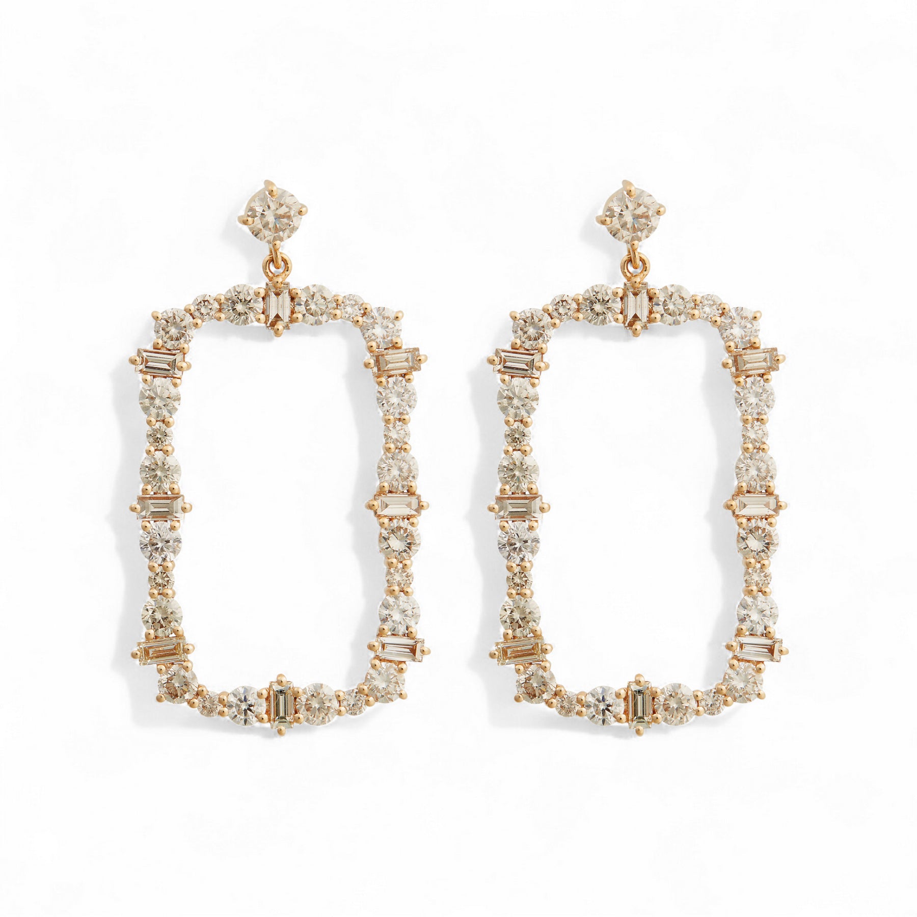 The Rivulet Flow Champagne Diamond Earrings by Ileana Makri capture the fluid rhythm of elegance in motion. Expertly handcrafted from 18k yellow gold, each earring features a graceful rectangular silhouette adorned with an exquisite combination of baguette and round light champagne diamonds. The open design evokes the gentle flow of water, shimmering with every movement — a modern statement of sophistication and timeless artistry.