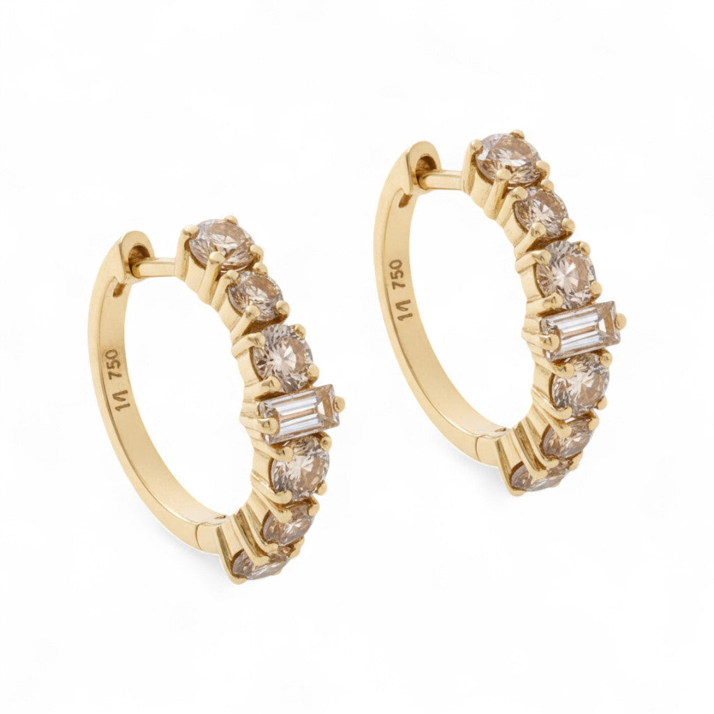 Exquisitely handcrafted from 18k yellow gold and set with round and baguette light champagne diamonds, the Round Rivulet Hoops are the perfect accessory for any look. The timeless and delicate design is sure to add the perfect touch of sophistication and elegance to any ensemble.