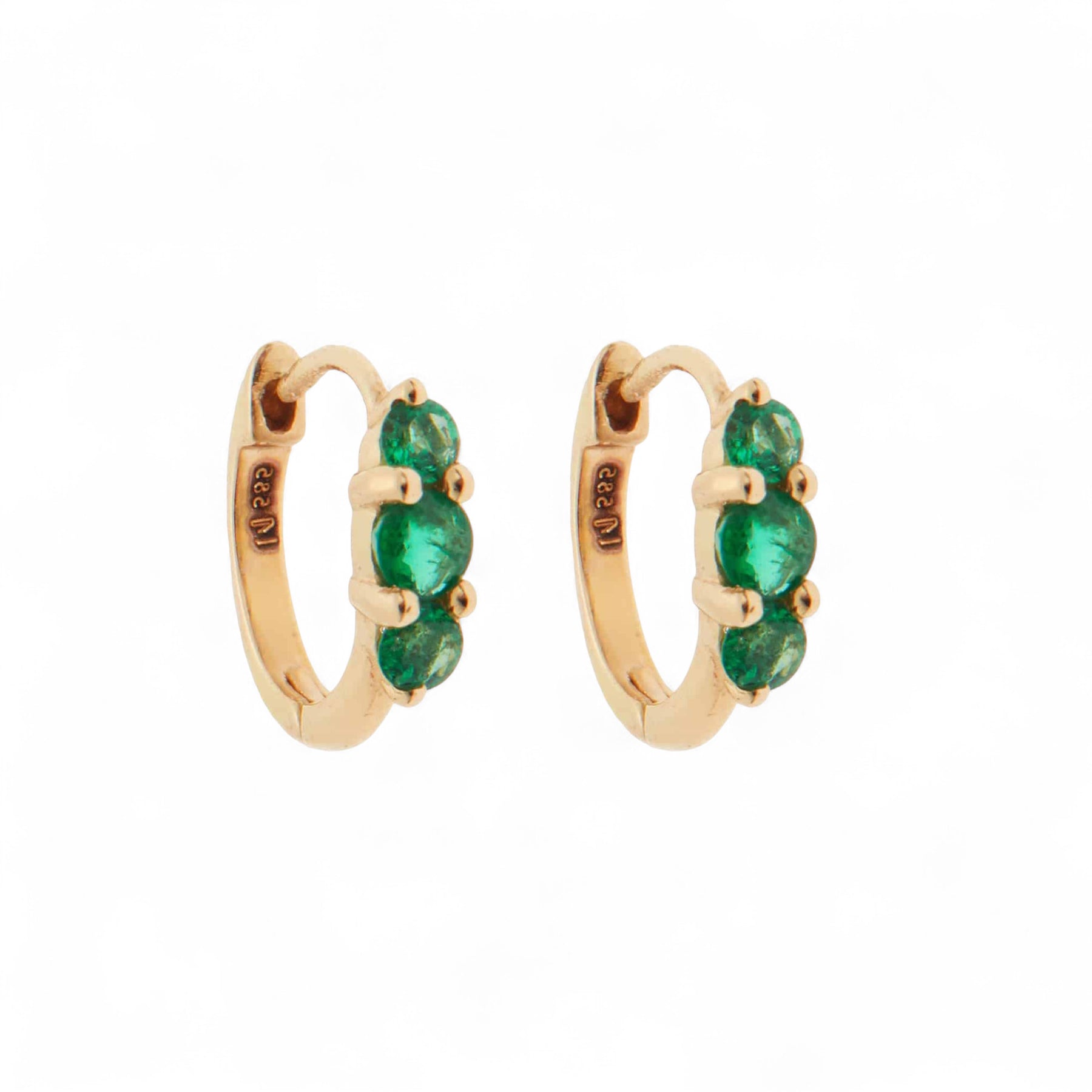 These Small Oval Hoops will elevate your look with a touch of classic charm. Expertly handcrafted from 14k yellow gold and featuring three shimmering emeralds, these hoops will add a sophisticated sparkle to any ensemble.