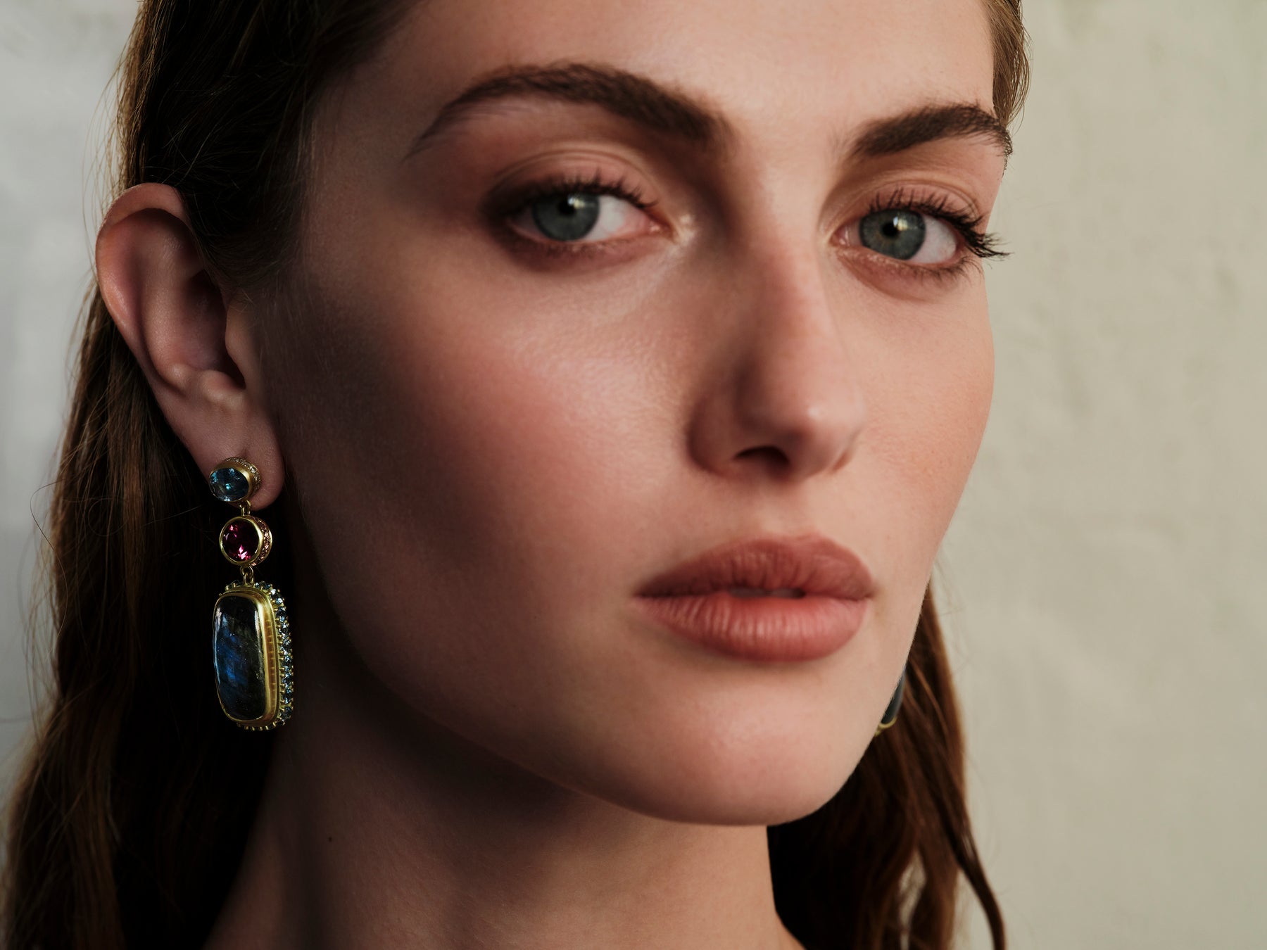 A statement of artistry and elegance, these one-of-a-kind earrings are crafted in 18k yellow gold and adorned with an exquisite medley of gemstones. At the center, shimmering labradorite radiates with mystical blue flashes, framed by brilliant accents of tourmaline, rhodolite, aquamarine, grey diamonds, and purple sapphires. Each stone has been carefully chosen for its unique character, creating a harmonious balance of color and light. Bold yet refined, these earrings are a true celebration of craftsmanship and individuality.