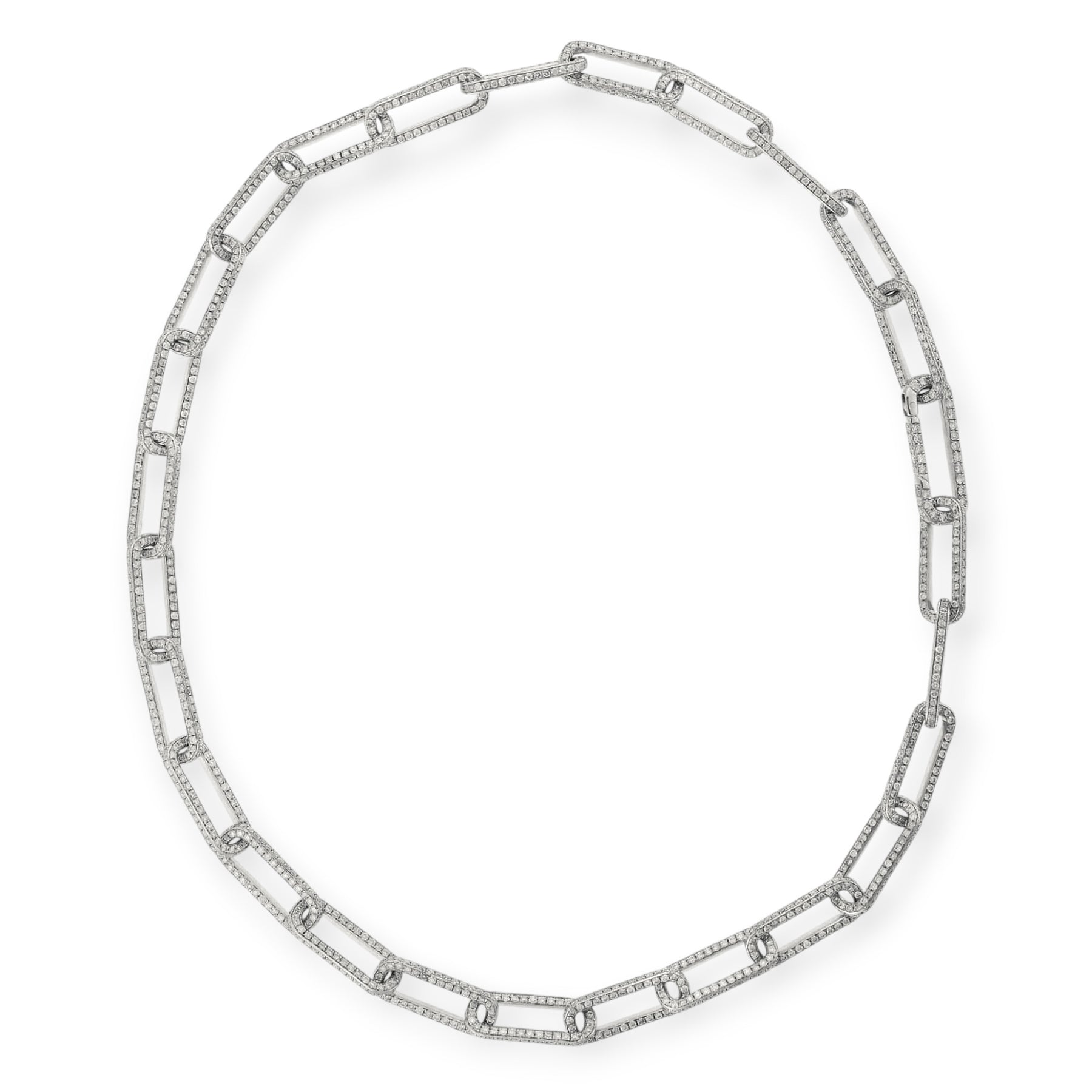 Exquisitely handcrafted in 18k white gold, this Seamless Pavé Diamond Oblong Link Necklace redefines classic chain elegance with a sculptural modern edge. Each elongated link is meticulously set with diamonds, totalling 25.0 carats, creating a continuous shimmer that catches the light from every angle. The necklace’s seamless design ensures fluid movement and a refined silhouette, perfect for layering or wearing as a statement of understated luxury.