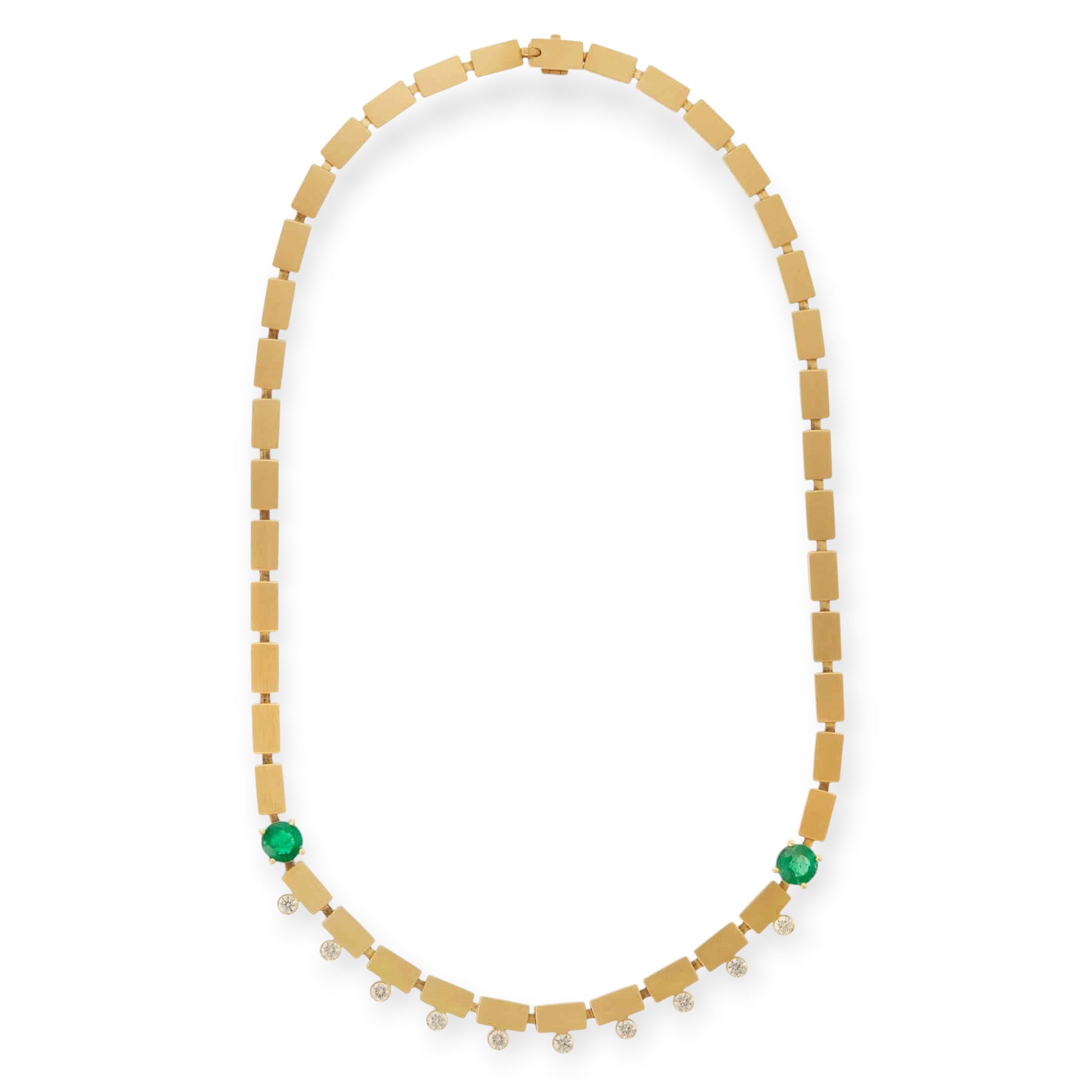 Adorned with shimmering emeralds and diamonds, our River Dew Necklace is a luxurious, handcrafted statement piece. Expertly crafted from 18k yellow gold, its satin finish celebrates the graceful ebb and flow of water in an elegant and exclusive design.