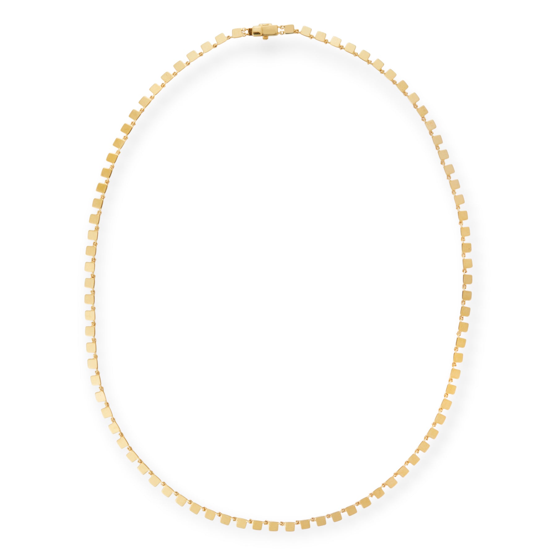 The Mini Tile Necklace, handcrafted from 18k yellow gold adds a touch of elegance to your daily look. Handcrafted and hinged together with precision, each 3mm tile shimmers with brilliance. The soft feel is perfect for everyday wear.