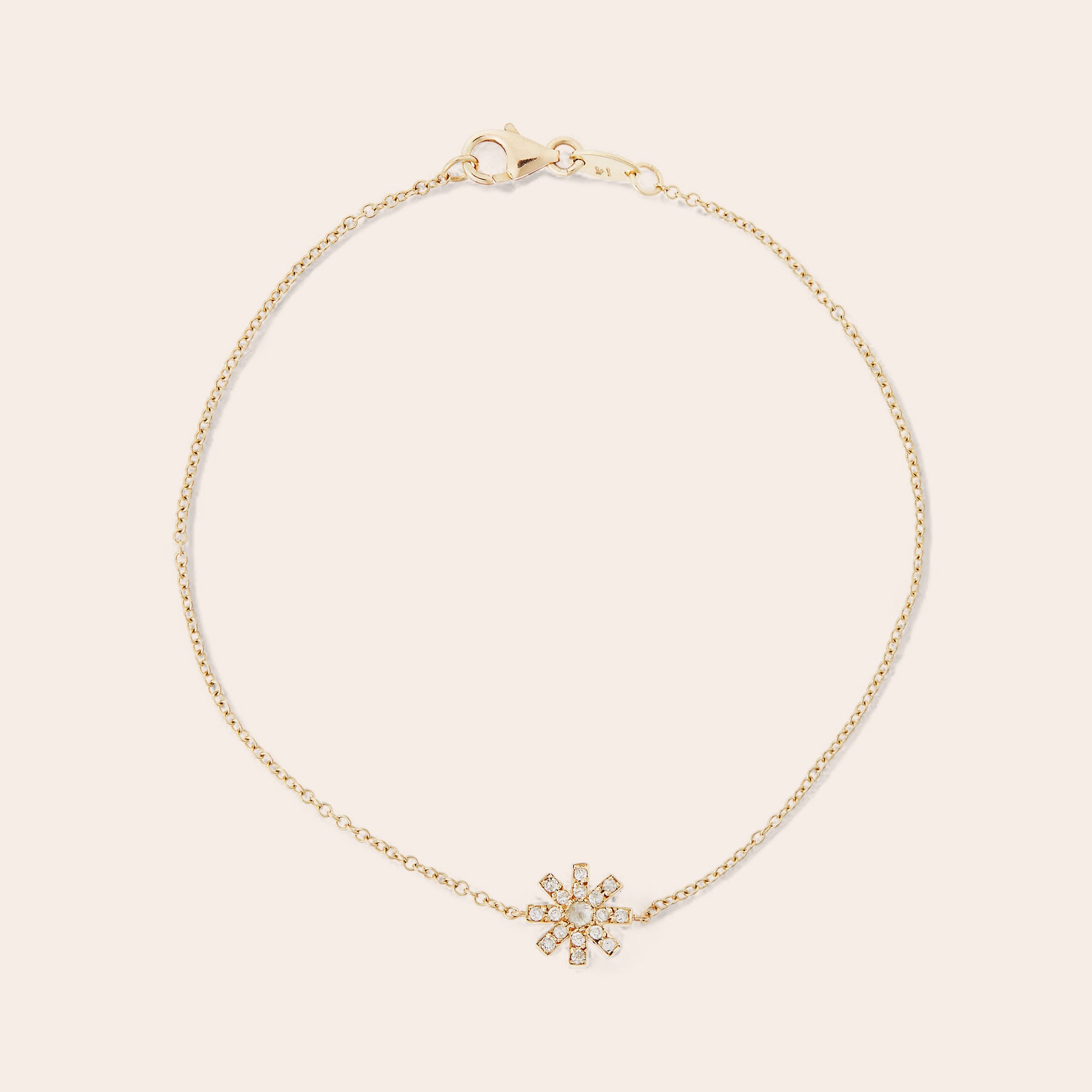 The Chaos Charm Bracelet is a delicate everyday piece with radiant impact. Crafted in 9k yellow gold and set with 0.24 carats of light champagne diamonds, the signature starburst motif sits at the center of a fine 17.5cm chain. Lightweight and versatile, it’s designed to be worn solo or layered effortlessly with other bracelets.