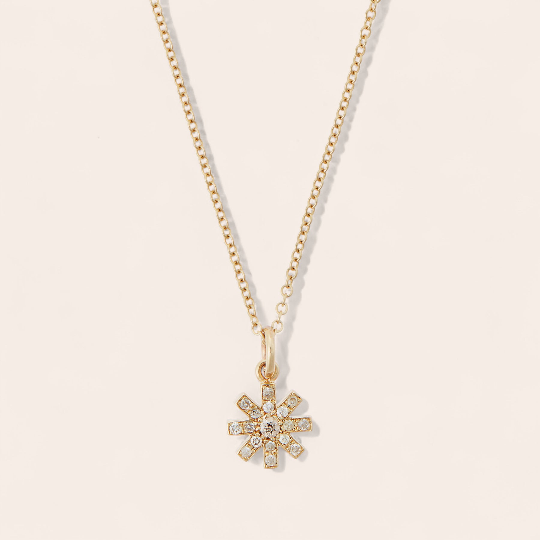 The Chaos Charm Necklace captures the brilliance of Ileana Makri’s signature starburst in a delicate pendant. Crafted in 9k yellow gold and set with 0.12 carats of light champagne diamonds, the charm hangs from a fine 9k gold chain with a secure lobster clasp. Available in three lengths. A timeless piece designed to be worn close to the heart, layered or solo.