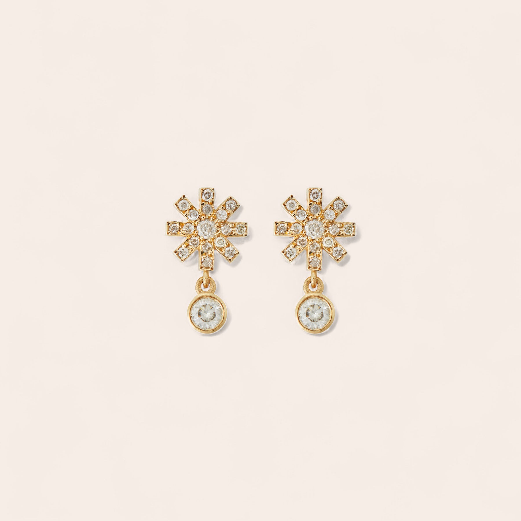 The Chaos Drop Studs reinterpret the starburst motif with a modern twist. Crafted in 9k yellow gold and set with 0.40 carats of light champagne diamonds, each stud features a radiant burst paired with a single bezel-set diamond drop. Delicate yet eye-catching, they offer the perfect balance of everyday ease and refined sparkle.