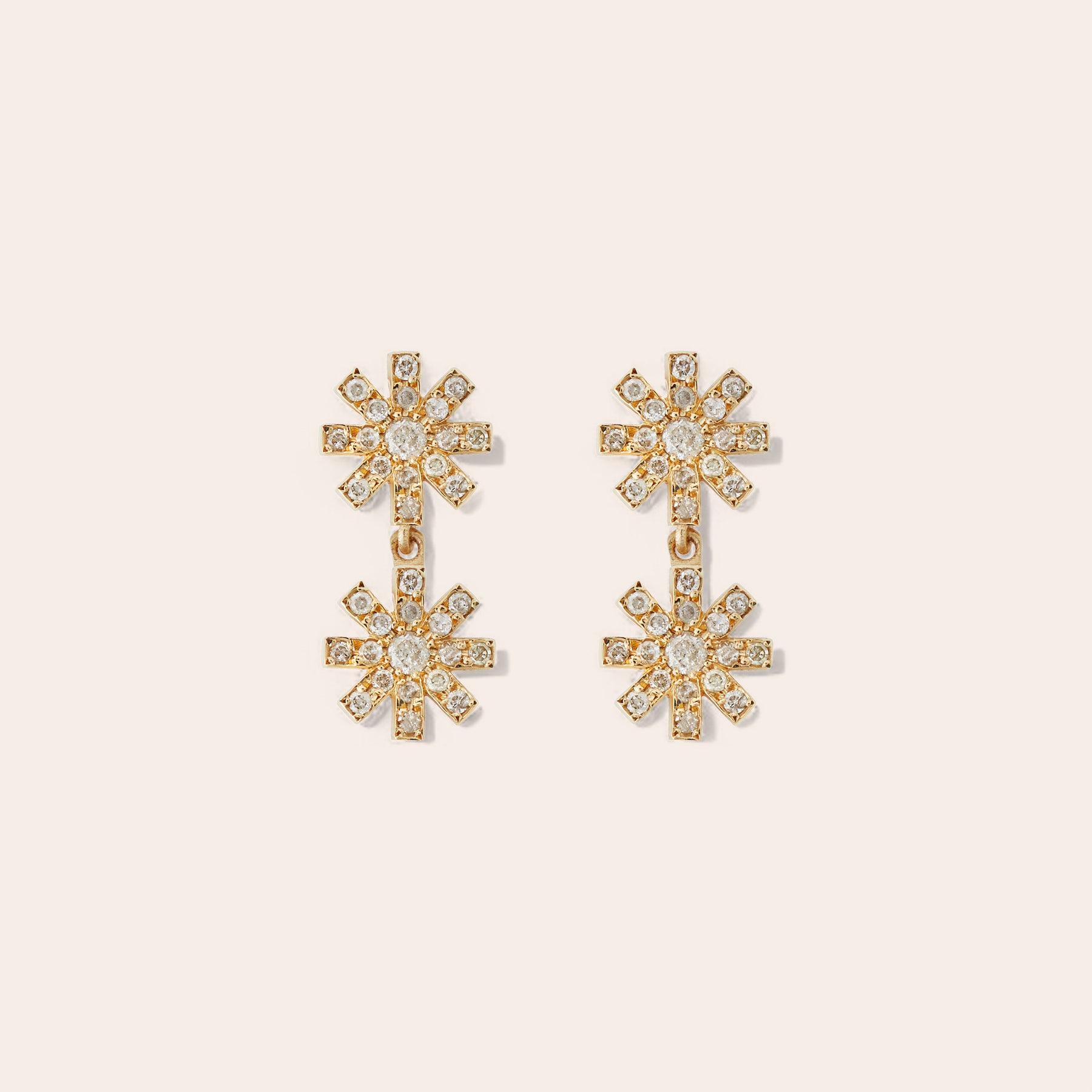 The Chaos Duo Drops reinterpret Ileana Makri’s iconic starburst motif in a fluid, double-drop silhouette. Crafted in 9k yellow gold and set with 0.44 carats of light champagne diamonds, these earrings move gracefully with every gesture, scattering light in all directions. Lightweight and radiant, they’re the perfect blend of everyday ease and evening glamour.