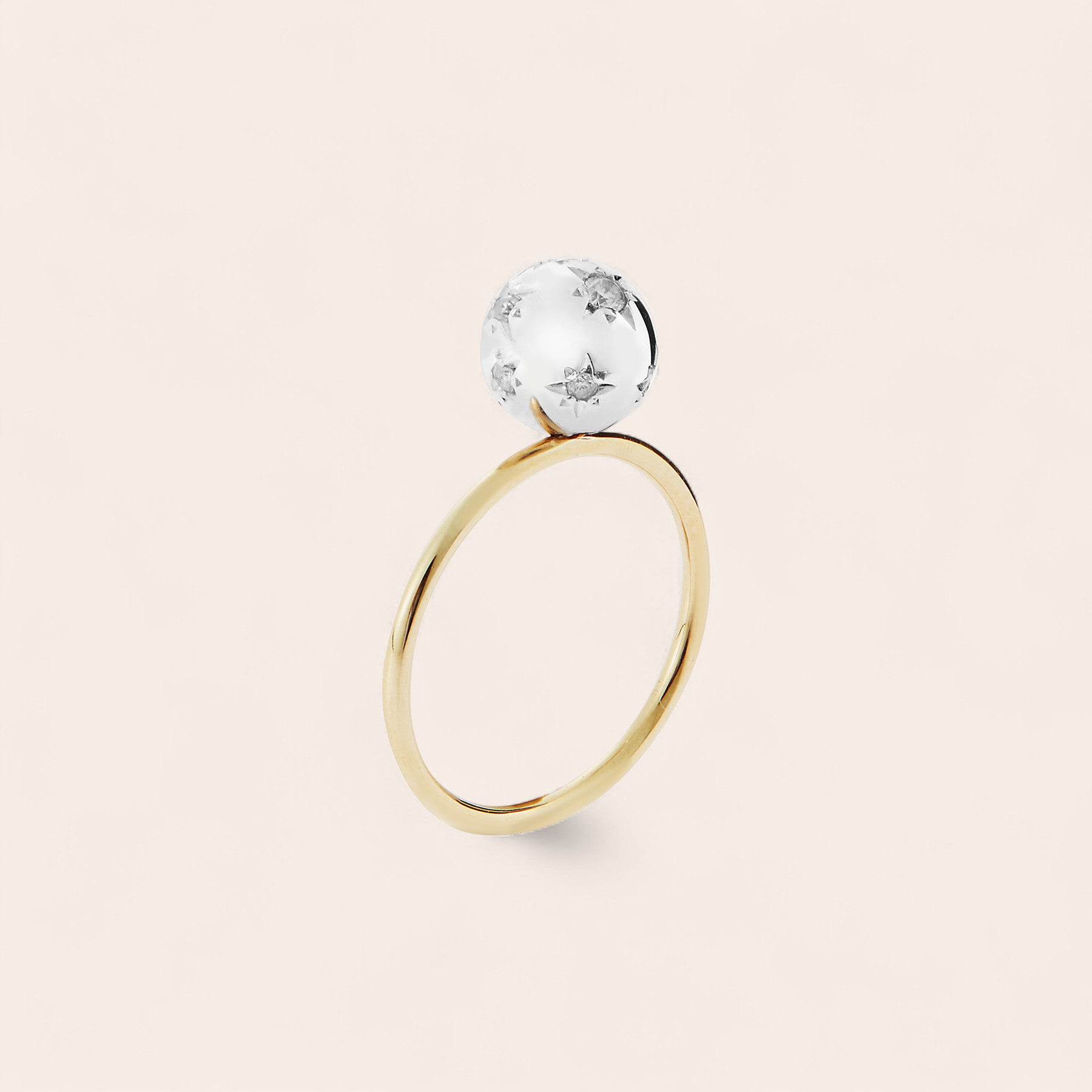 Playful and luminous, the Stardust Mini Disco Ring features a sterling silver disco-ball charm engraved with diamond-set stars, designed to swivel with movement. Crafted in 9k yellow gold and accented with 0.08 carats of light champagne diamonds, this delicate ring captures a celestial spirit in a modern, everyday piece. A perfect talisman for stacking or wearing solo.