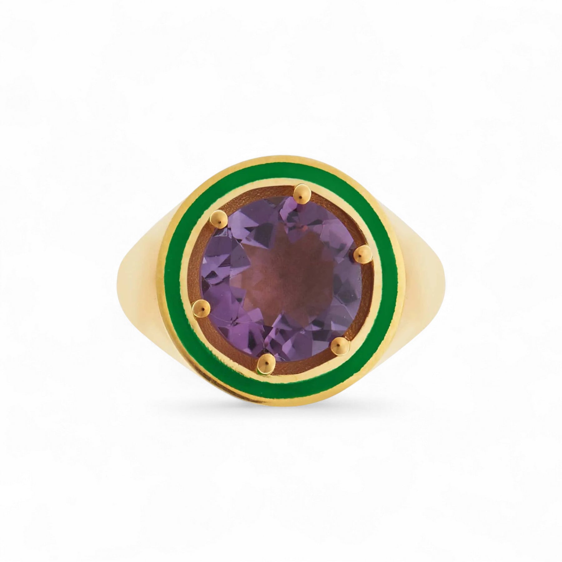 When you want your look to sparkle with a touch of regal style, the Amethyst Chevalier Ring is your go-to piece! Handcrafted with love in Sterling Silver and 18K gold plating, this pinky ring is crowned with a gorgeous central purple amethyst adorned all around with a halo of neon green enamel.