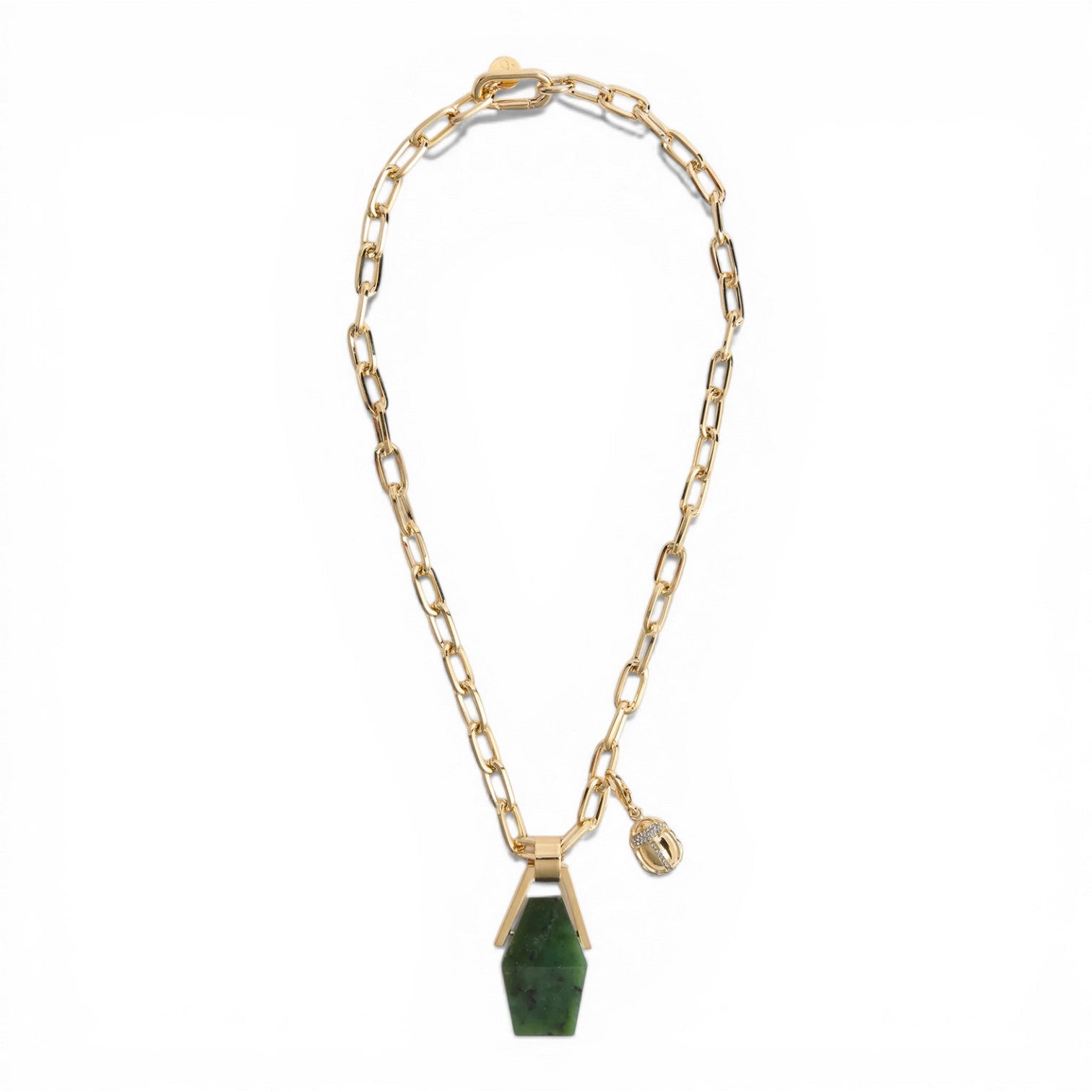 A bold pendant infused with rich symbolism, the Portal Necklace is crafted with a slice of green jade and finished with 24k gold-plated detailing on a statement chain. Long associated with abundance, longevity and good fortune, jade brings a sense of vitality and meaning to this sculptural design. Worn close to the heart, it makes an elegant statement on its own or layers beautifully with other necklaces for a more personal look.