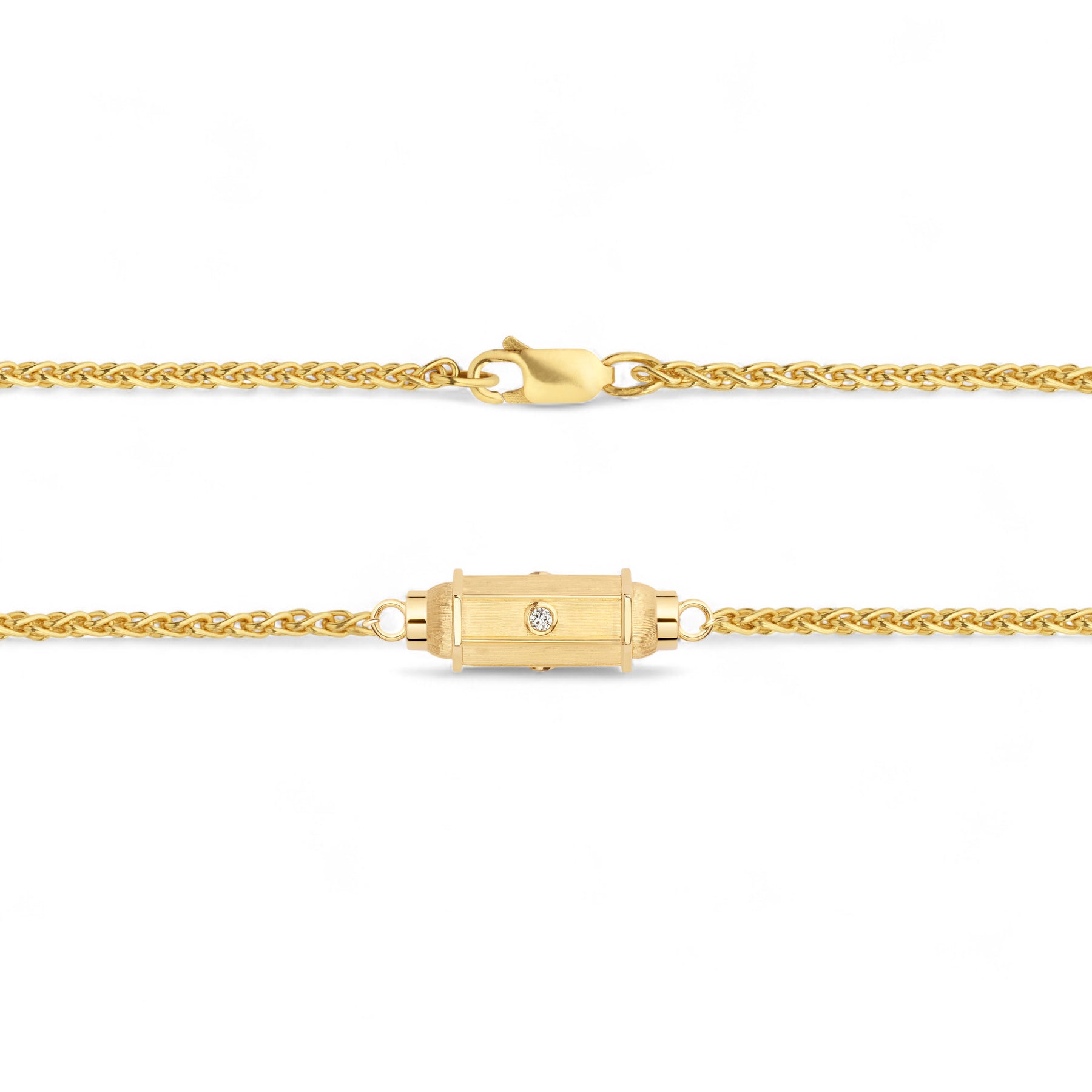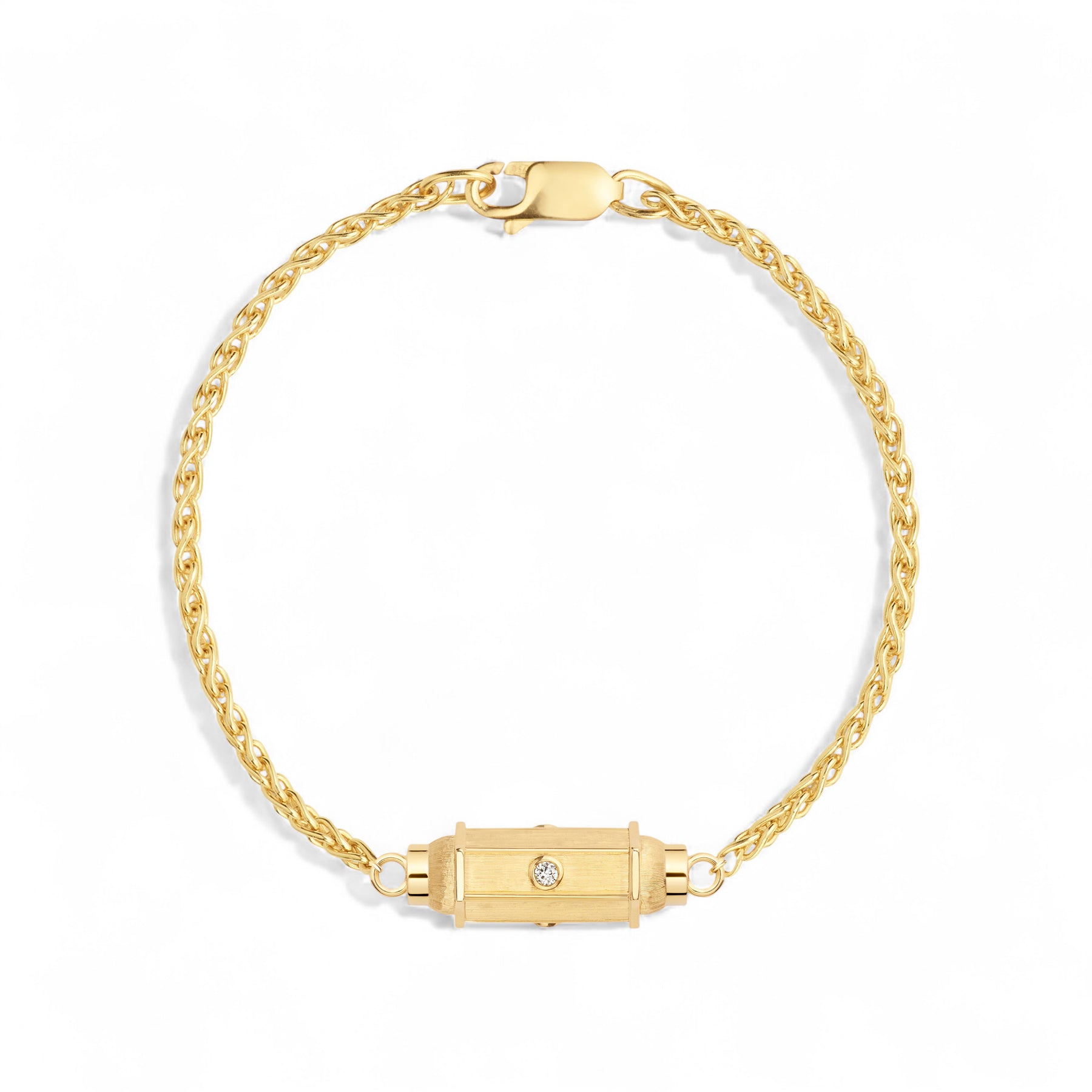 Indulge in luxury with the Micro coco Bracelet by Marie Lichtenberg. This 18k yellow gold bracelet features a delicate brushed finish and is elegantly formed by a micro locket on a spiga chain.