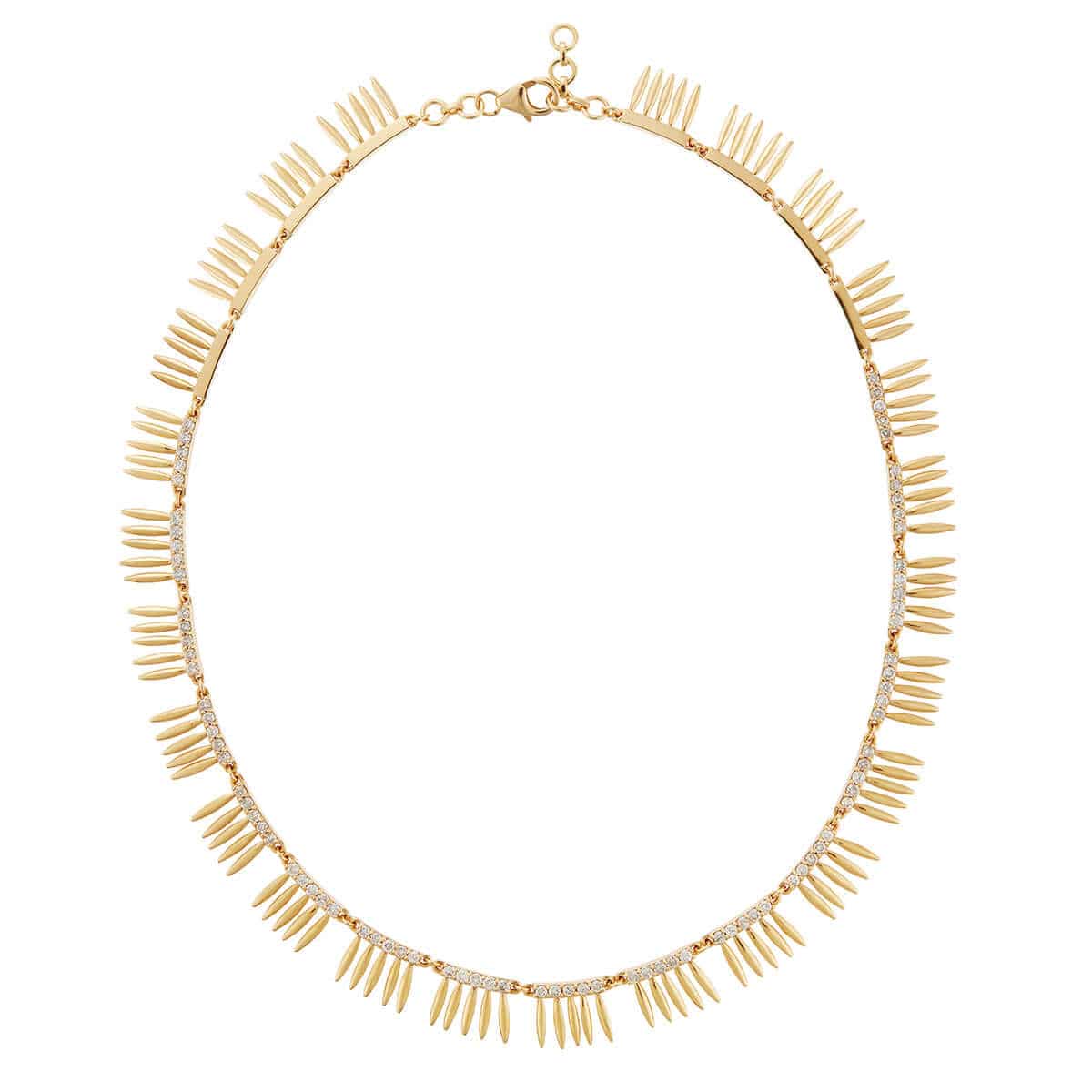 Handcrafted from 18k polished yellow gold, the Grass Sunny Leaves Necklace Υ-Lchd is a precious piece of luxury, inspired by the subtle beauty of nature. The 45cm-long necklace is set with sparkling Light Brown Diamonds, that gracefully sparkle over the animated polished gold grass blades, creating a unique and elegant piece of jewelry.