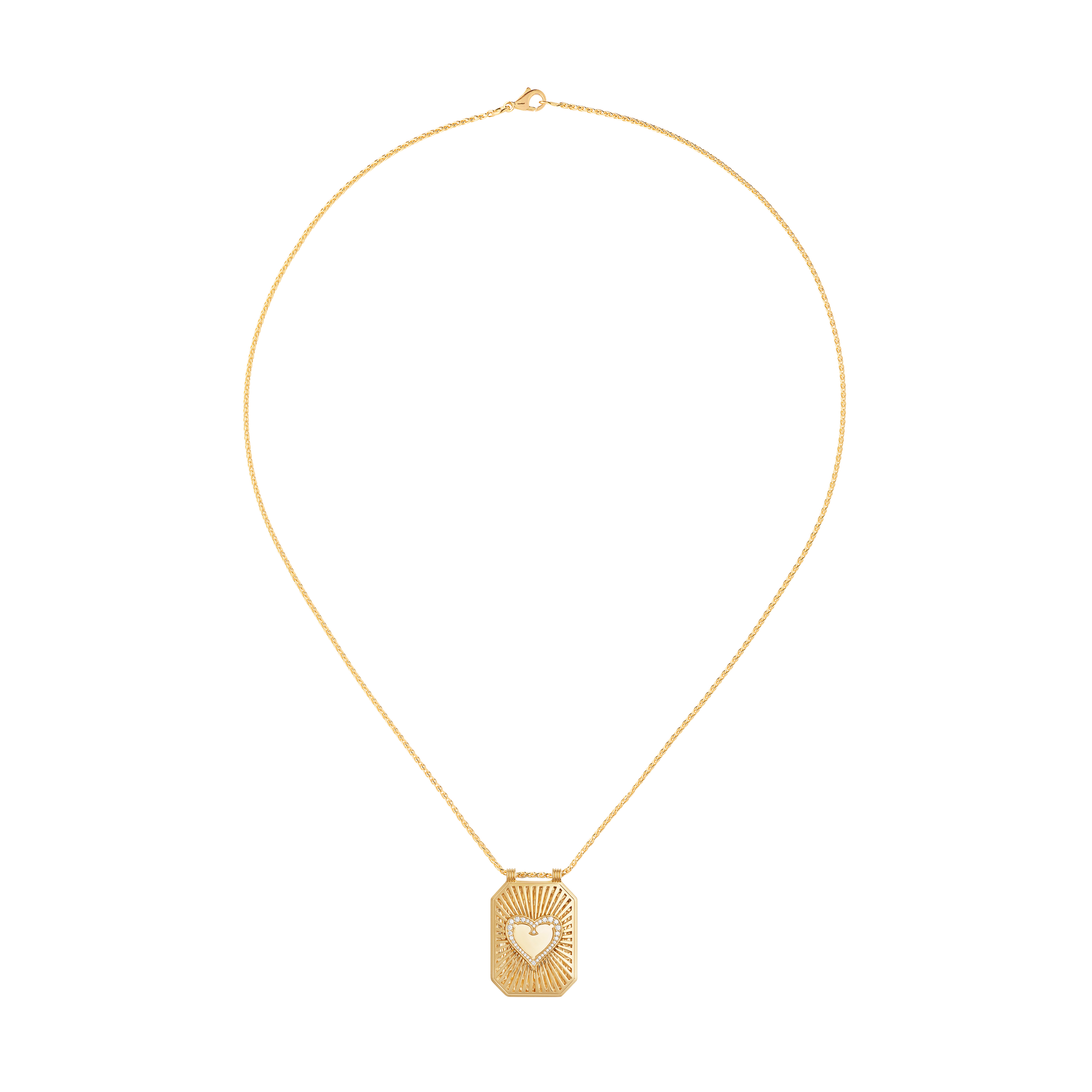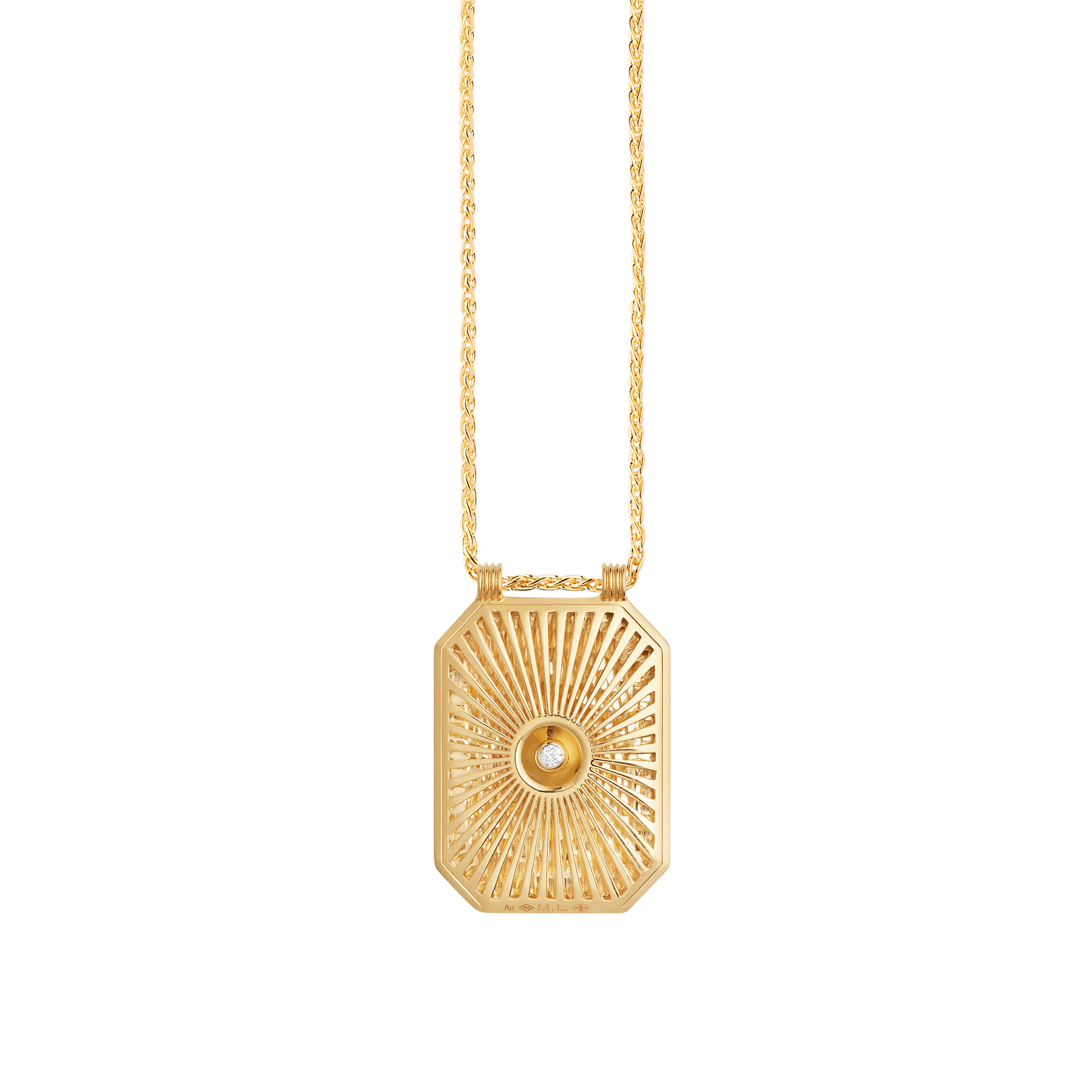 Crafted in 18k yellow gold, the Heart Diamond Scapular by Marie Lichtenberg is a radiant expression of love and protection. At its center, a glowing heart is outlined with sparkling white diamonds, set within a sunburst openwork pendant that captures and reflects the light with every movement. On the reverse, a single diamond adds a discreet, symbolic detail—perfectly hidden close to the wearer. Suspended on a 44cm yellow gold chain, this luminous piece is both timeless and deeply personal.