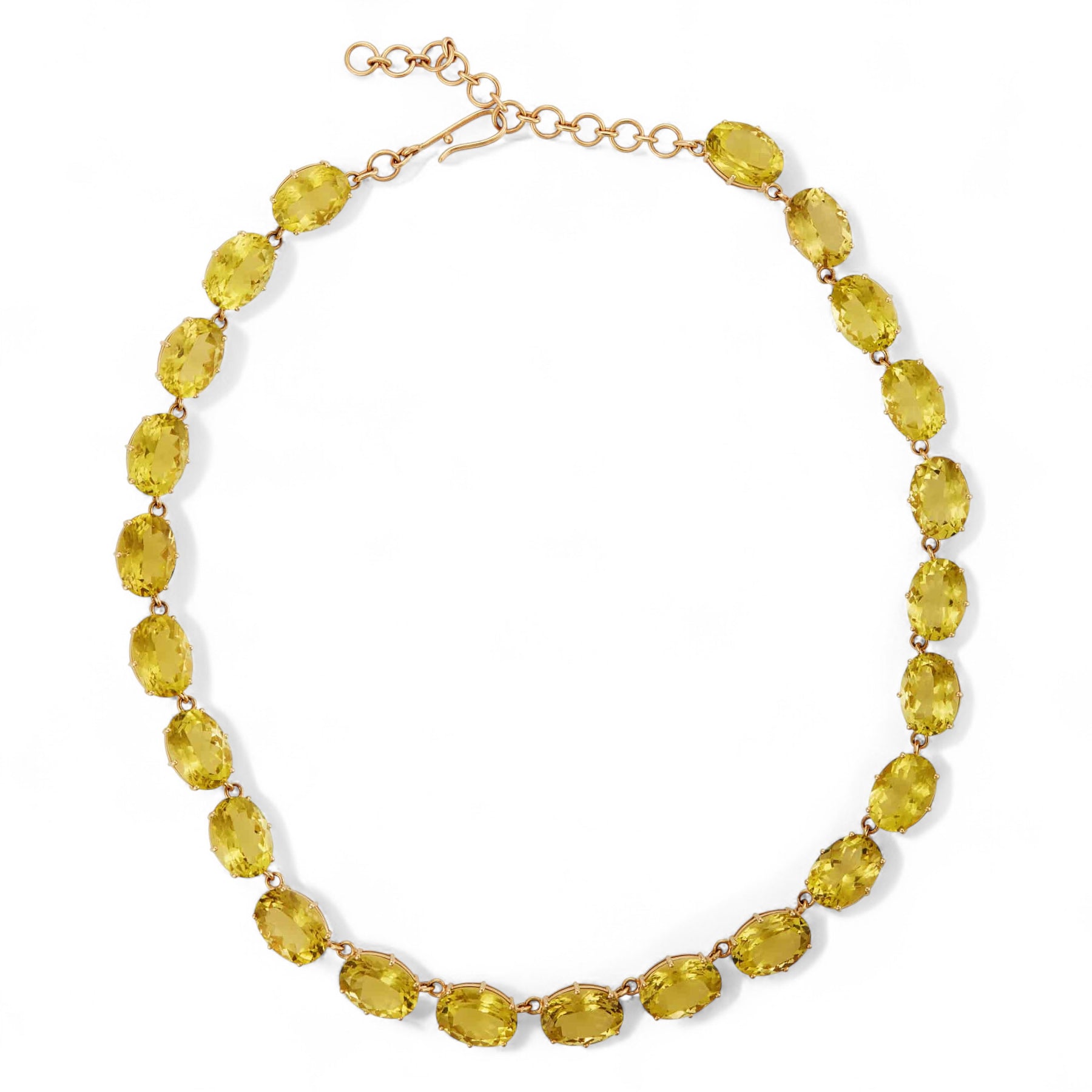 Adorn yourself in the lavish luxuries of the Crown Necklace Lemon Quartz by Ileana Makri. Handcrafted with 138 cts of beguiling Lemon Quartz each set in a 14k polished yellow gold crown. The necklace is accompanied by an 18k gold chain extension (38-45cm) at the clasp so you can adjust to your liking.