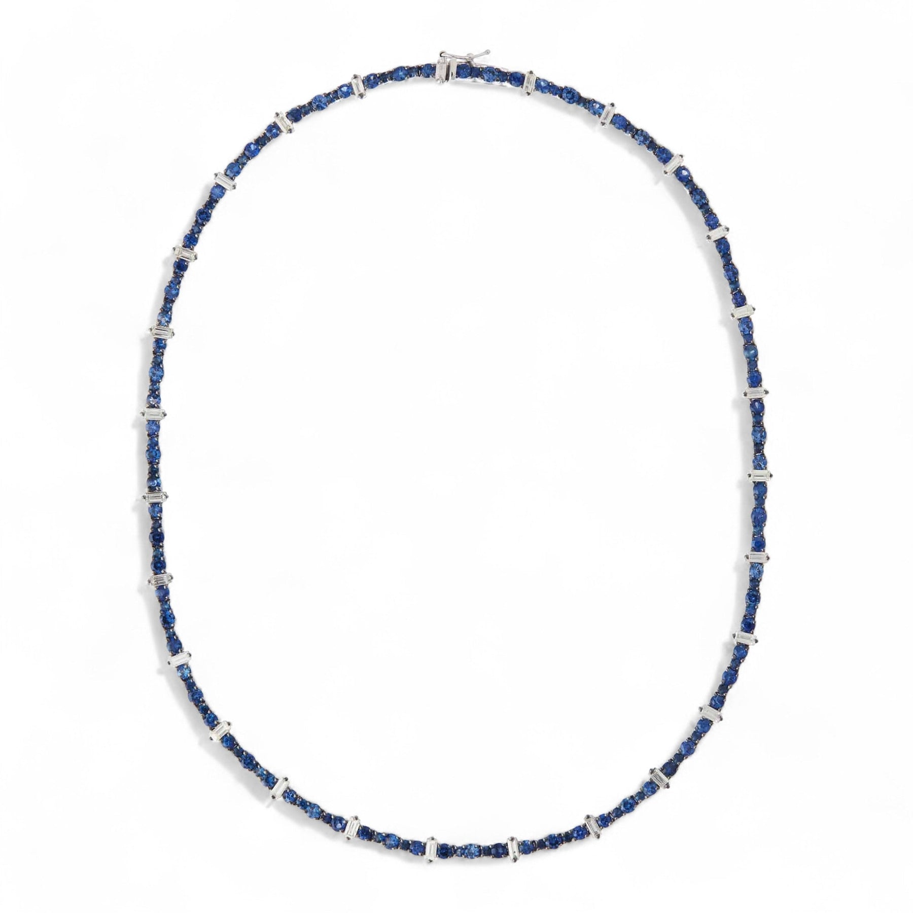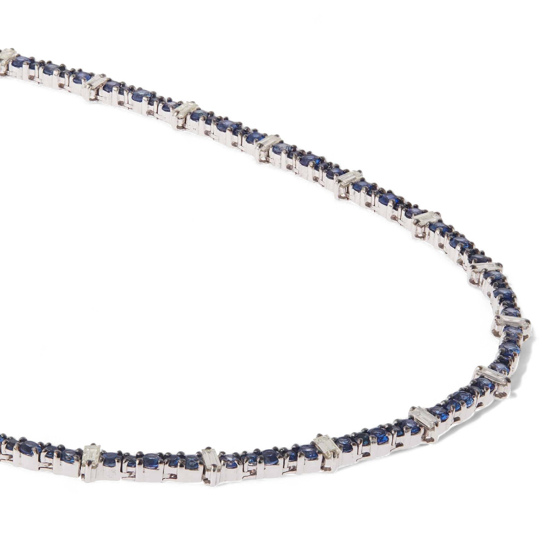 The Rivulet Bleu Blanc Necklace by Ileana Makri is a captivating expression of grace and luminosity. Handcrafted from gleaming 18k white gold, this design features a flowing arrangement of deep blue sapphires and brilliant white diamonds that capture the essence of water in motion. Each stone is meticulously set to evoke a rhythm of light and shadow — a seamless balance between serenity and brilliance. A masterpiece of contemporary elegance, it’s a timeless adornment for the modern woman.