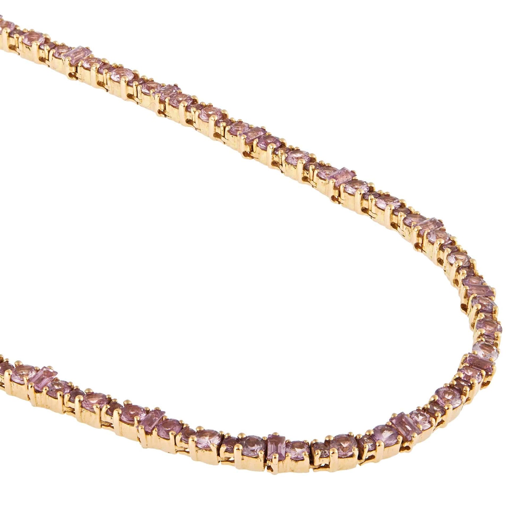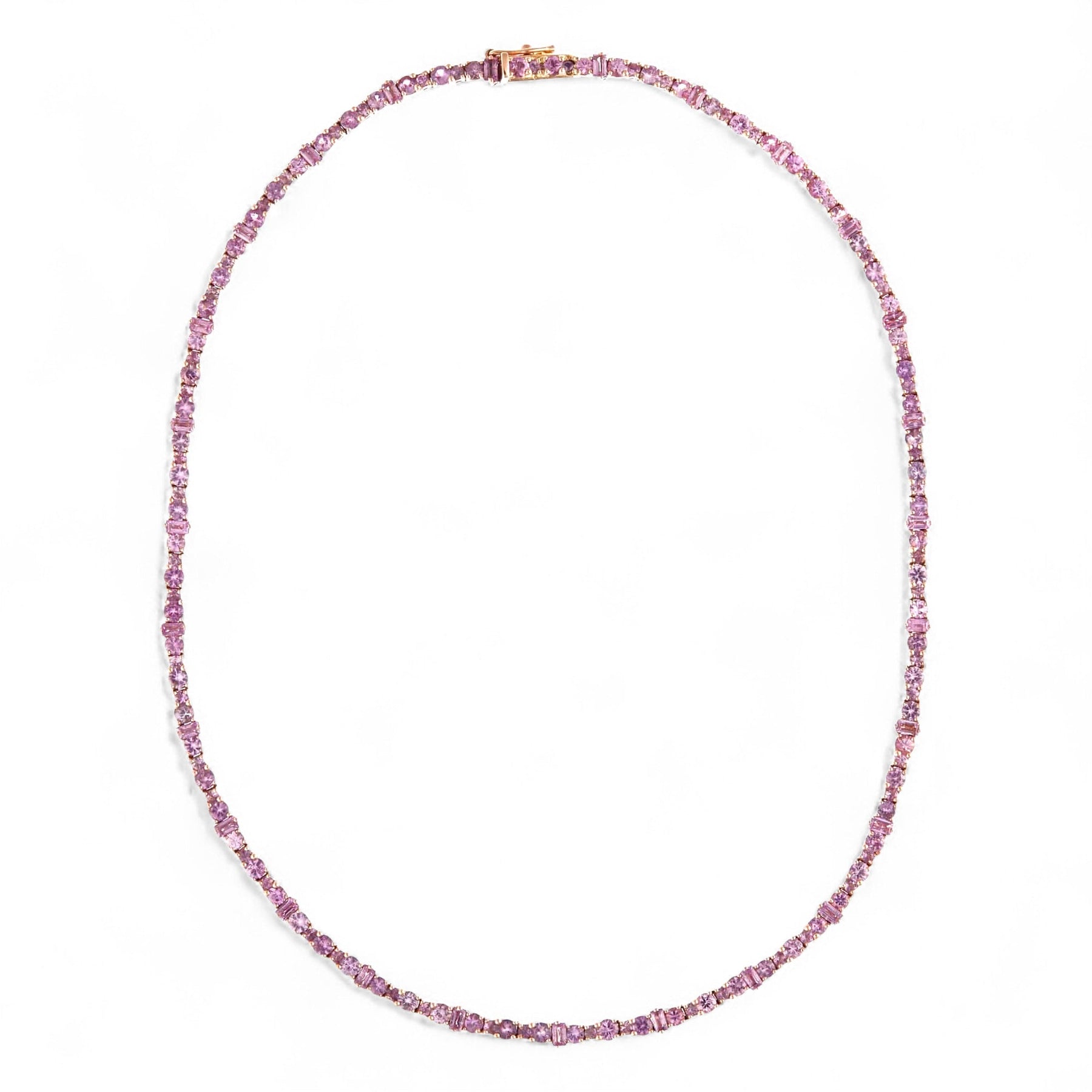 The Rivulet Pink Sapphire Necklace by Ileana Makri radiates femininity and grace, embodying the fluid beauty of flowing water. Expertly handcrafted from luminous 18k rose gold, this captivating piece is adorned with a continuous stream of round and baguette-cut pink sapphires, each one shimmering with soft brilliance. The delicate hue and graceful rhythm of its design evoke both strength and serenity — a timeless expression of refined luxury and modern elegance.